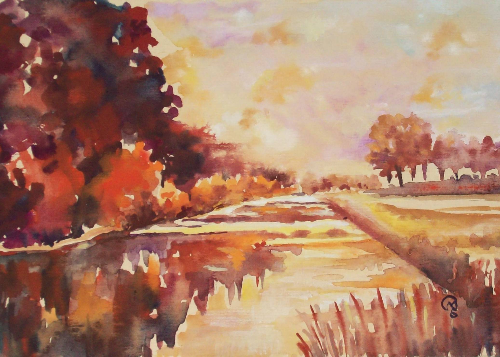 Obraz emanuje ciepłem i spokojem jesiennego wieczoru. Dominują tu kolory złota, pomarańczu i głębokiej czerwieni, idealnie współgrając z miękkimi, rozmytymi kształtami drzew i chmur. Krajobraz jest jakby zanurzony w ciepłym blasku zachodzącego słońca, które delikatnie rozświetla powierzchnię wody. Uciekająca w dal droga, otoczona po obu stronach taflą wody, prowadzi wzrok ku horyzontowi, gdzie drzewa delikatnie zlewają się z niebem. Atmosfera obrazu jest wyjątkowo sielankowa. Czujemy się jakbyśmy spacerowali wśród spadających liści, słysząc jedynie szelest trzech gałązek. Ciepło bijące od kolorów potrafi skutecznie owinąć nas przyjemnym uczuciem nostalgii. Ten obraz to kwintesensja jesieni, nastrojowego momentu tuż przed nadejściem zimy. Artysta zastosował technikę akwareli, co dodaje lekkości i fluidności całej kompozycji. Farby rozlewają się swobodnie, a ich subtelne przejścia pozwalają na naturalne mieszanie barw. Wygląda jakby artysta pozwolił kolorom tańczyć na kartce, a efekt jest magiczny. Dla mnie osobiście ten obraz to comfort. Mogłabym godzinami wpatrywać się w tę scenę, wyobrażając sobie długie rozmowy przy ciepłej herbacie. To właśnie magia sztuki, która potrafi wywołać takie emocje. A dzieciak powiedziałby: "Chcę tam pobawić się w kałużach!". I miałby rację. Bo kto by nie chciał?