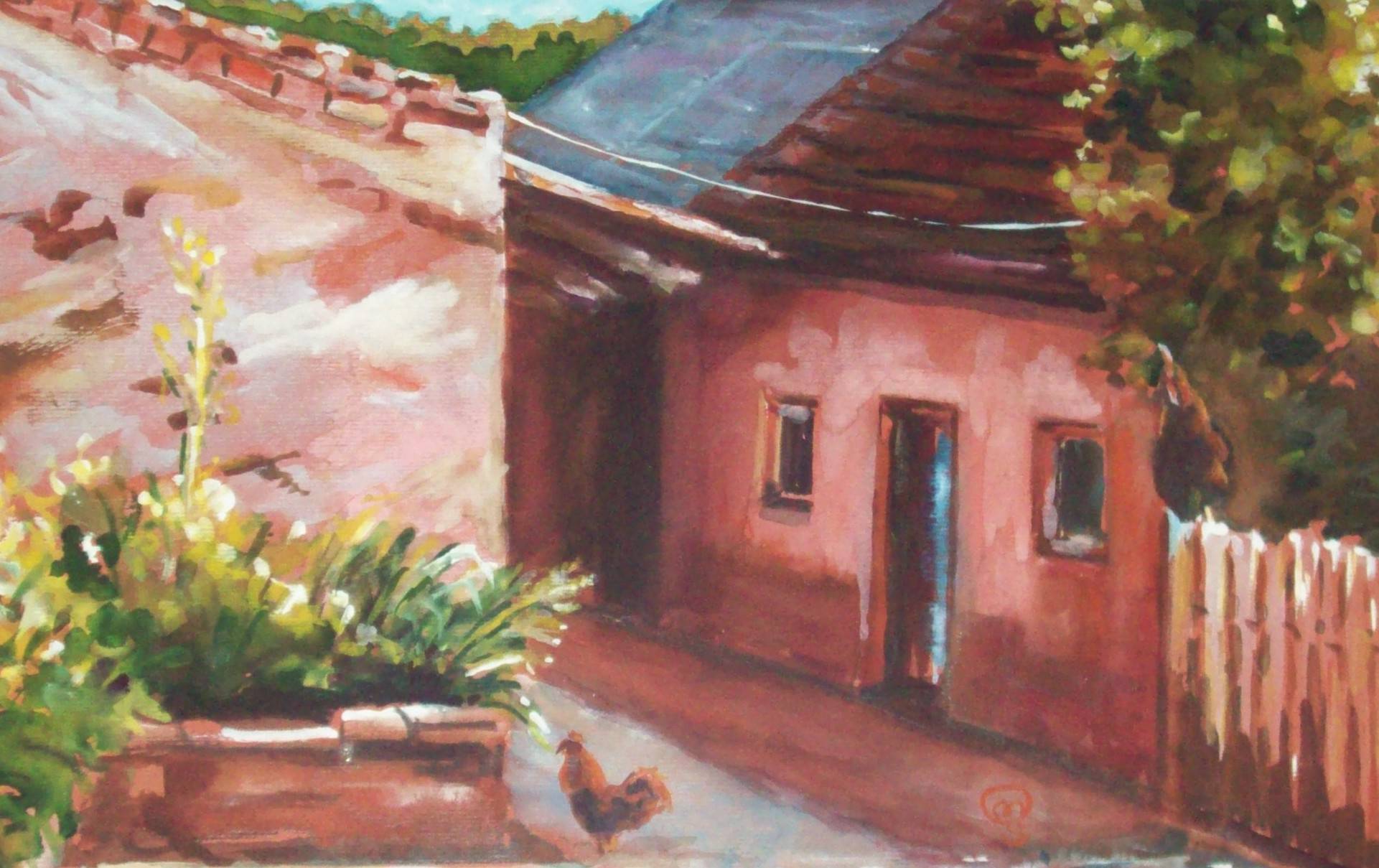 Obraz tchnie spokojem letniego popołudnia na wsi. Kamienny mur, w ciepłych odcieniach różu i czerwieni, łagodnie kontrastuje z ciemnozielonymi krzewami i drzewami. Dach pokryty dachówką lekko przechyla się, tworząc cienie, które dodają kompozycji głębi. A cock standing in the middle of the scene, dumnie obwieszcza swoją obecność, jakby był władcą tego małego królestwa. Nastrój jest leniwy, ale pełen ciepła. Możesz prawie usłyszeć śpiew ptaków i poczuć zapach kwiatów. Artysta zastosował miękki, impresjonistyczny styl. Pociągnięcia pędzla są śmiałe, ale precyzyjne, co nadaje obrazowi lekkości i ruchu. Pastelowe kolory wzmacniają uczucie harmonii i nostalgii. Obraz wywołuje w widzu poczucie błogiego spokoju i przywołuje wspomnienia z dzieciństwa spędzonego na wsi. Może nawet ktoś poczuje ukłucie tęsknoty za czasami, kiedy życie było prostsze. Ojej, chcę tam wrócić na lato i bawić się z kogutem. Patrząc na to dzieło, trudno nie rozmarzyć się o ciepłym słońcu na twarzy i zapachu letnich dni.