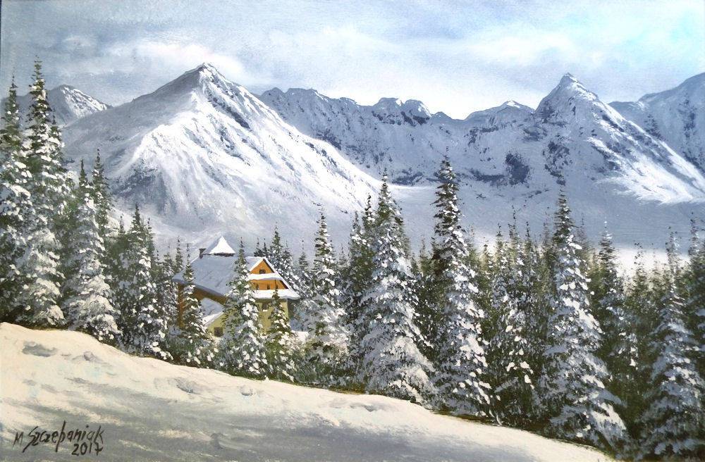 M. Szczepaniak "Tatry - schronisko Murowaniec" olej na płótnie 60x40cm wykonany ręcznie, sygnowany, werniksowany