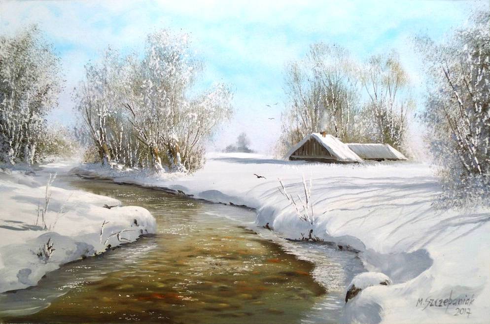 M. Szczepaniak "Na skraju wsi" olej na płótnie 60x40cm wykonany ręcznie, sygnowany, werniksowany