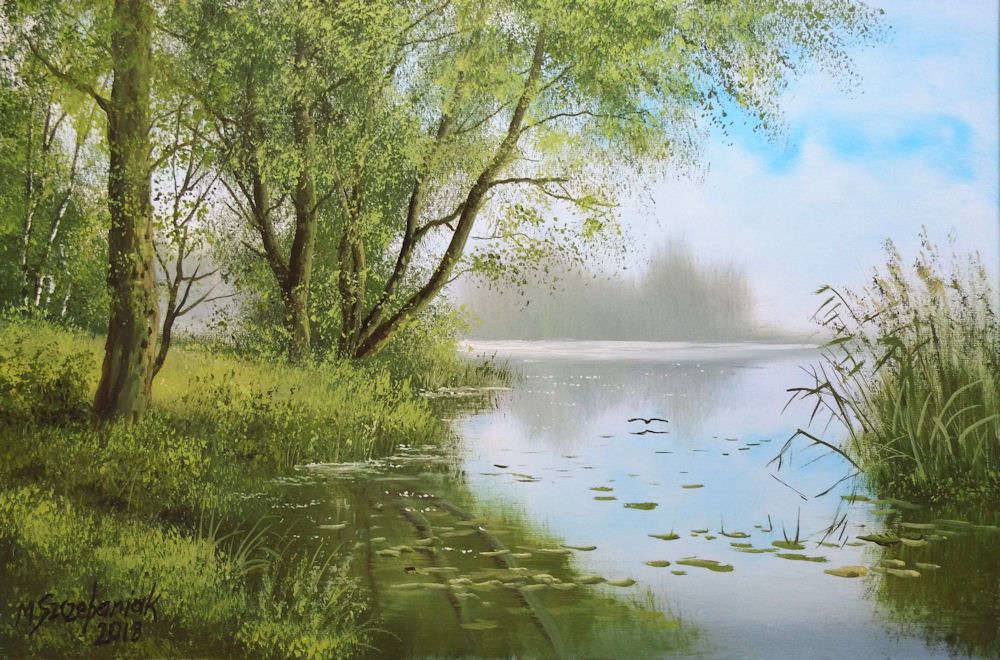 M. Szczepaniak "Nad rozlewiskiem" olej na płótnie 60x40cm wykonany ręcznie, sygnowany, werniksowany