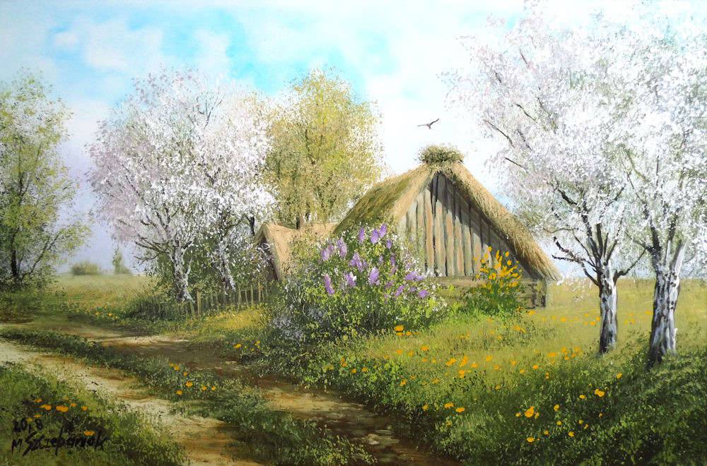 M. Szczepaniak "Wiosna na wsi" olej na płótnie 60x40cm wykonany ręcznie, sygnowany, werniksowany