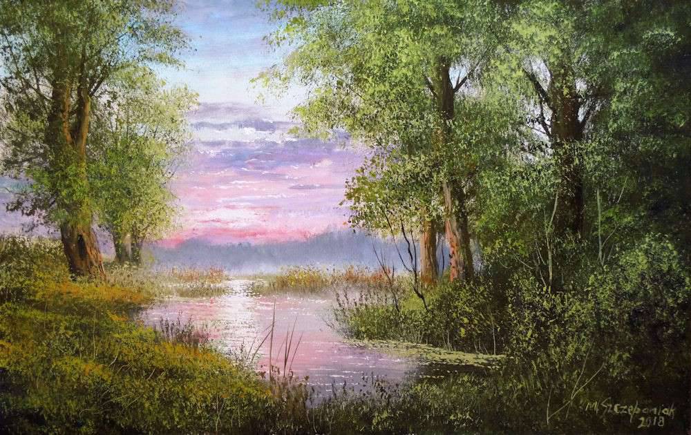 M. Szczepaniak "Świt na mokradłach" olej na płótnie 60x40cm wykonany ręcznie, sygnowany, werniksowany
