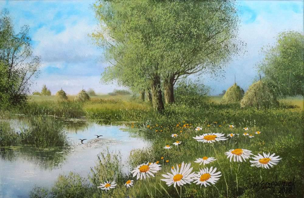 Marek Szczepaniak "Wśród łąk" olej na płótnie 60x40cm wykonany ręcznie, sygnowany, werniksowany