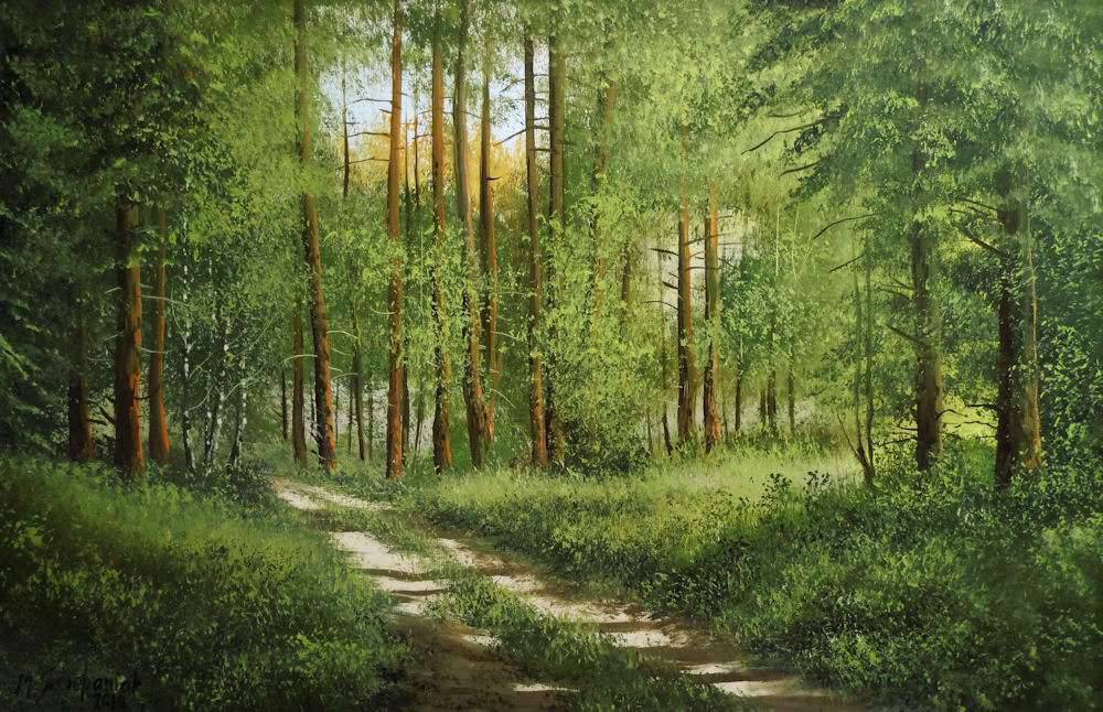 Marek Szczepaniak "Droga w lesie" olej na płótnie 60x40cm wykonany ręcznie, sygnowany, werniksowany