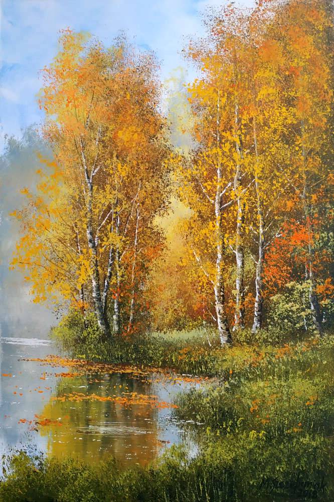 M. Szczepaniak "Jesień nad leśnym stawem" olej na płótnie, 40x60cm, na blejtramie, sygnowany, werniksowany