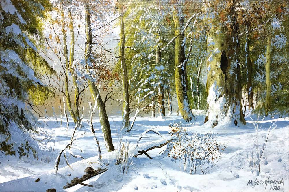 Marek Szczepaniak "Zima w lesie" olej na płótnie, 60x40cm, na blejtramie, sygnowany, werniksowany