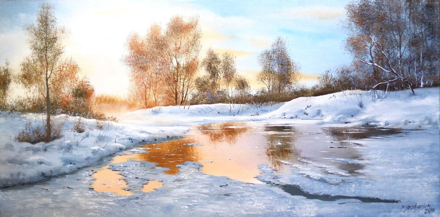 M. Szczepaniak "Zima na rozlewisku" olej na płótnie 100x50cm wykonany ręcznie, sygnowany, werniksowany