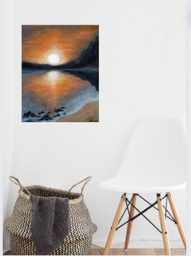 Obraz namalowany akrylami na bawełnianym płótnie o wymiarach 40x50 przedstawiający magiczny pomarańczowy zachód słońca nad plażą, tuż przed dotknięciem horyzontu przez słońce. Ciepła kolory wprawiają w optymistyczny nastrój, przywodzą wspomnienia z wakacji. Praca nie wymaga ramy, boczne krawędzie płótna zamalowane, co pozwala na bezpośrednie zawieszenie na ścianie. Jest zawerniksowany błyszczącym werniksem zabezpieczającym farbę przed czynnikami zewnętrznymi. Sygnowany na odwrotnej stronie.