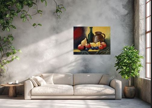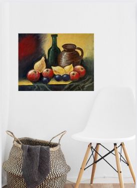 Kompozycja z elementami owoców i naczyń malowana techniką mieszaną (akryl i olej) na bawełnianym płótnie o wymiarach 35x45. Praca nie wymaga ramy, boczne krawędzie płótna zamalowane, co pozwala na bezpośrednie zawieszenie na ścianie .Obraz można oprawić. Bardzo ładnie będzie wyglądał w drewnianej grubej ramie. Sygnowany na stronie przedniej, jaki i na odwrocie