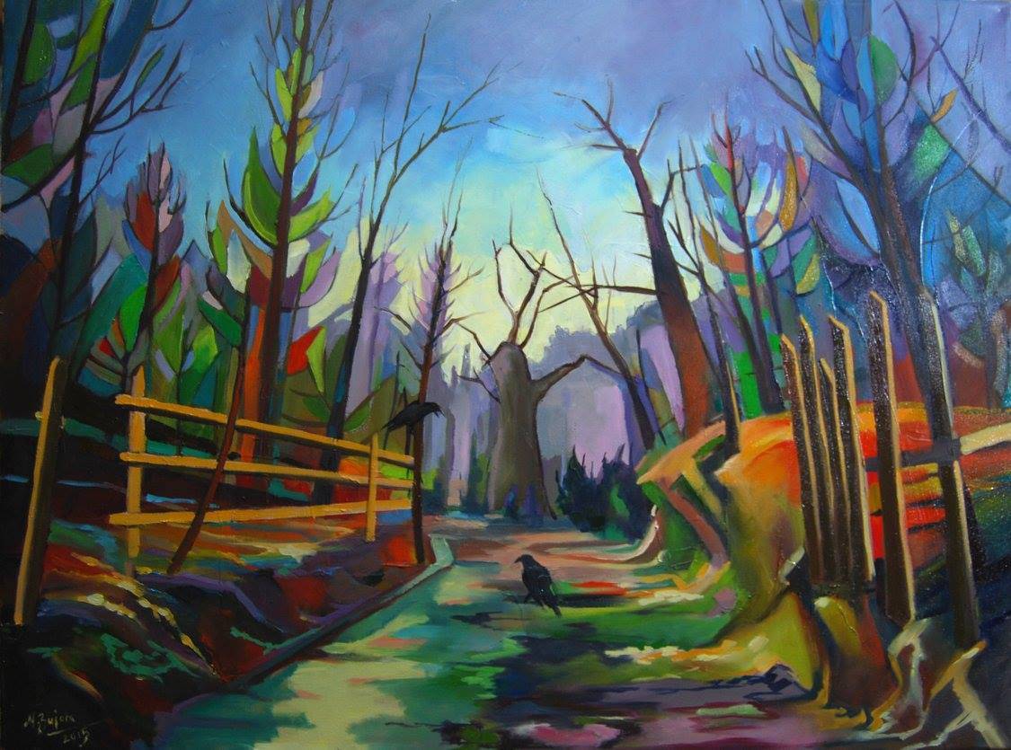 Obraz przedstawia dialog dwóch czarnych kruków żyjących w odmiennym dla nich kolorowym świecie.