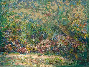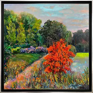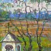 Na obrazie widzimy malowniczą scenę wiejską, pełną ciepłych barw i delikatnych pociągnięć pędzlem. Dominują zielenie i brązy, a w tle majaczą błękitne góry. Pod drzewem, ze zwisającymi fioletowymi kwiatami, stoi kapliczka z czerwoną dachówką. Malarskie plamy i impasty dodają fakturze dynamiki. Dwoje ludzi, być może para, spaceruje ścieżką w stronę kapliczki. "Patrz, drzewo jest duuuże!" - takie myśli mogłyby przemknąć przez głowę dziecka. Atmosfera tego miejsca jest spokojna i sielska, jakby czas płynął tu wolniej. Czuć rustykalny urok i melancholię przeszłości. Artysta posłużył się techniką impresjonistyczną, skupiając się na świetle i chwilowym nastroju, o to chodzi w tej technice. To praca, która przyciąga wzrok swoim harmonijnym układem. Emocje płynące z obrazu są ciepłe, jak rodzinny piknik na wsi, nostalgia za prostymi czasami. Przy oglądaniu tego dzieła można poczuć wewnętrzny spokój i tęsknotę za naturą. Moim zdaniem, artysta udało się uchwycić esencję prostoty i piękna codzienności. A takie momenty, choć ulotne, są warte zapamiętania.