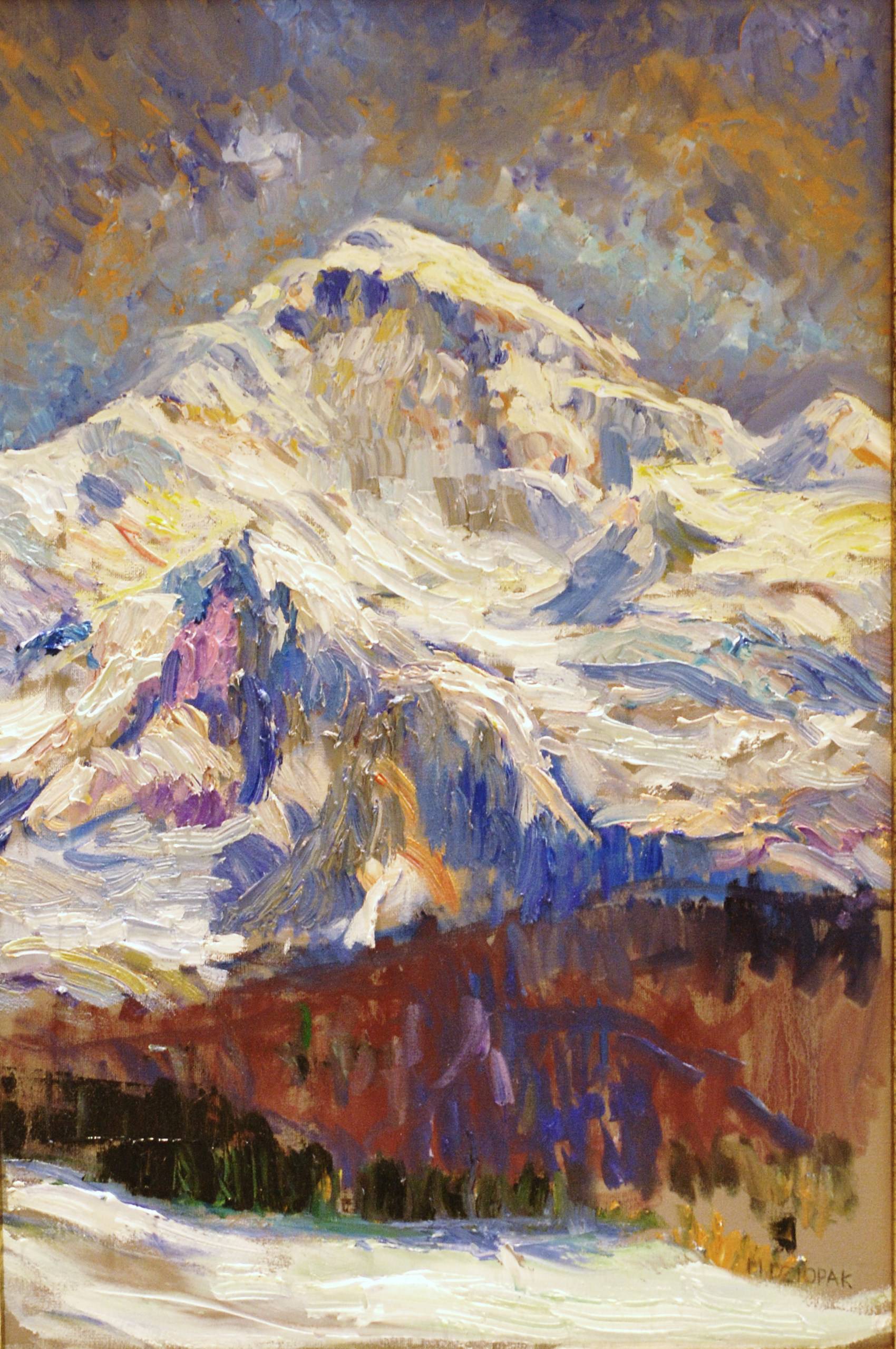 Na obrazie widzimy majestatyczny górski krajobraz, pełen kontrastowych kolorów i dynamicznych linii. Dominują barwy zimowe: biel śniegu przeplata się z fioletami, błękitami i miękkimi odcieniami pomarańczu. W tle niebo, lekko zachmurzone i rozmyte, dodaje dramatyzmu. Artysta użył impasto, co sprawia, że farba wydaje się niemal trójwymiarowa, a powierzchnia tętni życiem. Pędzle przemieszczają się swobodnie, pozostawiając wyraźne ślady. Ich energiczność wprowadza wrażenie ruchu, jakby góry były żywą istotą. Obraz emanuje spokojem, ale i pewną dzikością. Czujesz, że to miejsce, gdzie natura pozostaje nieposkromiona. Może przywodzić na myśl poczucie wolności, tęsknotę za przygodą. To taki picture, który zostaje w głowie na długo. Sprawia, że stajesz się częścią tej surowej piękności. Wyobraź sobie, że jesteś tam, czujesz zimny wiatr na twarzy. Myślę, że dzieci powiedziałyby - „To górska bajka”. Każdy ruch pędzla to gest natury.
