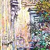 Na tym malowidle królują ciepłe, złotawe odcienie, które odbijają się od starych, zdobionych ścian – jakby podkreślały ich historyczny urok. Całość spowita jest miękkimi plamami koloru, gdzie róże i zielenie zlewają się w bujnej roślinności po prawej stronie. Artysta postawił na delikatne, ale jednocześnie kontrastowe przejścia między słońcem a cieniem, które wciągają widza w magiczny zakątek. Technika, nieco przypominająca impresjonizm, sprawia, że obraz emanuje nostalgiczną atmosferą. Patrząc na to dzieło, ma się wrażenie, jakby czas stanął w miejscu. Gdzieś w rogu słychać echo przeszłości, a ciepłe promienie słoneczne zdają się szeptać opowieści o dawnych czasach. Malarz, wykorzystując lekkie pociągnięcia pędzlem, wydobył dreamy vibe tego miejsca. Tajemniczy zaułek przyciąga wzrok detalami, które zdają się ożywać na płótnie, a odbiorca niemal czuje zapach wilgotnej ziemi po deszczu. Widząc to, małe dziecko mogłoby powiedzieć: „To wygląda jak tajemniczy ogród, gdzie mieszkają wróżki!”. Obraz wzbudza ciekawość, zachęca do eksploracji i sprawia, że chce się zanurzyć głębiej w jego historię. To coś więcej niż tylko obraz – to podróż w czasie i przestrzeni.
