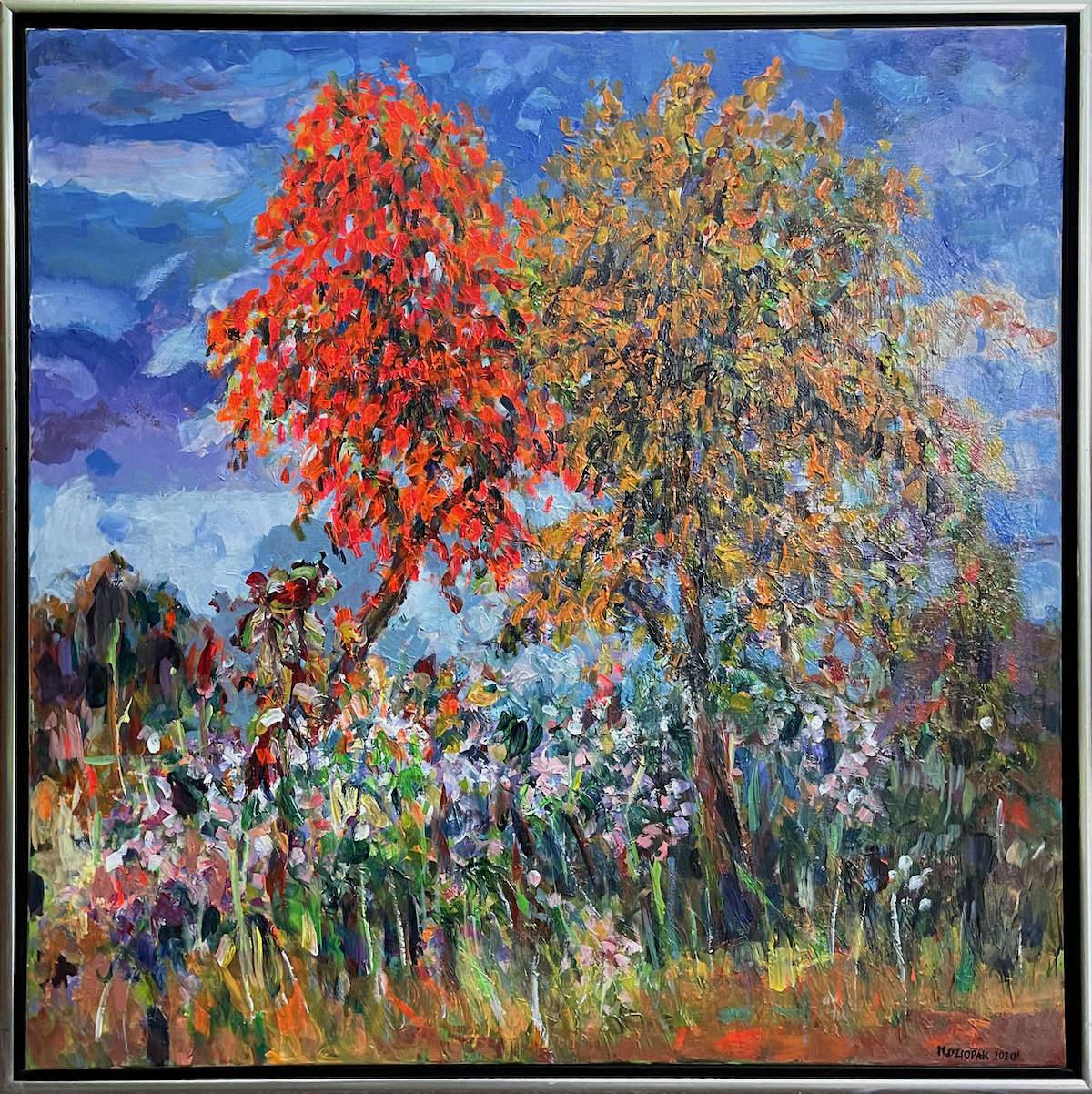 Obraz emanuje eksplozją kolorów. Dominują intensywne pomarańcze i czerwienie przeplatające się z żółtawymi barwami drzew, które dumnie stoją na tle głębokiego, niebieskiego nieba. Kompozycja wydaje się dynamiczna, jakby drzewa tańczyły na wietrze. Cała scena przypomina radosny festiwal kolorów jesieni. Jest tu jakis taki spokój, ale i energia, która wciąga widza do środka. Artysta zastosował technikę impasto, co dodaje tekstury i głębi, można niemal poczuć fakturę liści. Ta bogata warstwa farb sprawia, że każdy szczegół jest wyraźny, a obraz ożywa na naszych oczach. Obraz może przywołać u widza różne emocje, od nostalgii po dziecięcą radość z patrzenia na bujność natury. Ja wiem, bo też lubię takie widoczki. Całość wydaje się mówić: "look, nature's magic!" To jak wspomnienia z ciepłych dni w parku. Atmosfera jest pełna optymizmu, jak przypomnienie o pięknie, które nas otacza. Ten krajobraz skłania do refleksji nad przemijającą naturą, ale i naszym miejscem w tym magicznym świecie.