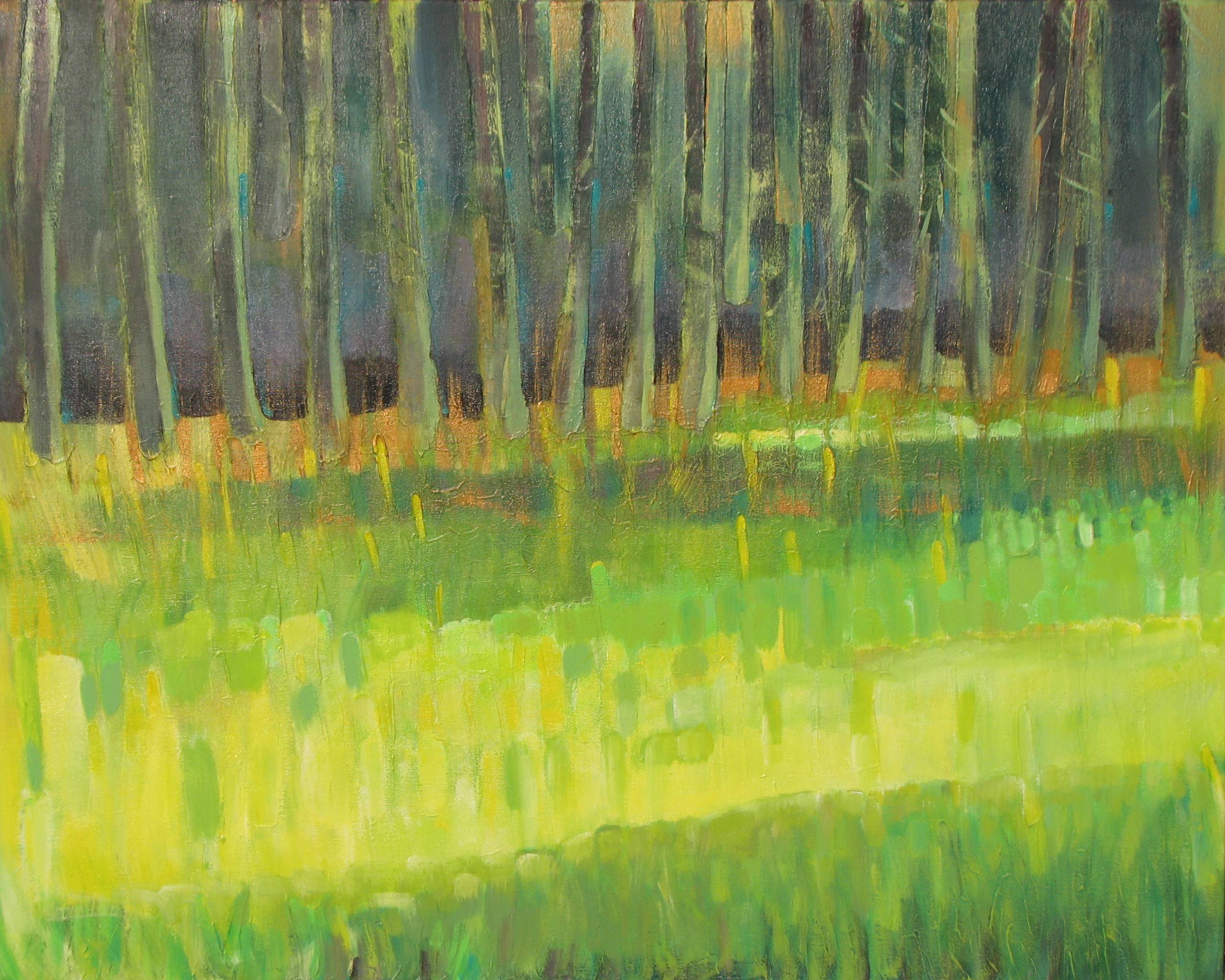 Obraz tętni zielenią, od soczystych limonkowych tonów po głębokie, niemalże złamane zielenie drzew w tle. To jakby patrzeć na ścianę lasu, gdzie światło delikatnie przenika przez liście. Kompozycja jest dość prosta, lecz nie brakuje w niej dynamiki, wyrażonej poprzez pionowe linie pni drzew, które niemal tańczą w swojej statyczności. Atmosfera jest spokojna i medytacyjna. Człowiek czuje się jakby zanurzał się w zielonym deep calm. Technika stosowana przez artystę, zapewne impresjonistyczna, ukazuje swobodną grę pędzla, kładąc nacisk na barwę i światło, a nie detal. Dzieciak powiedziałby: Te drzewa wyglądają jak patyczki! Patrząc na obraz, można poczuć lekki dreszcz nostalgi za letnimi spacerami. Uspokaja, daje wrażenie bycia w samym sercu natury. Moje myśli błądzą ku leniwym popołudniom spędzonym w lesie, gdzie każdy oddech troszkę spowalnia czas. Ciekawe, że tak prosty pejzaż może wywołać tyle emocji. Obraz przypomina mi, jak ważne są te chwilę zatrzymania.