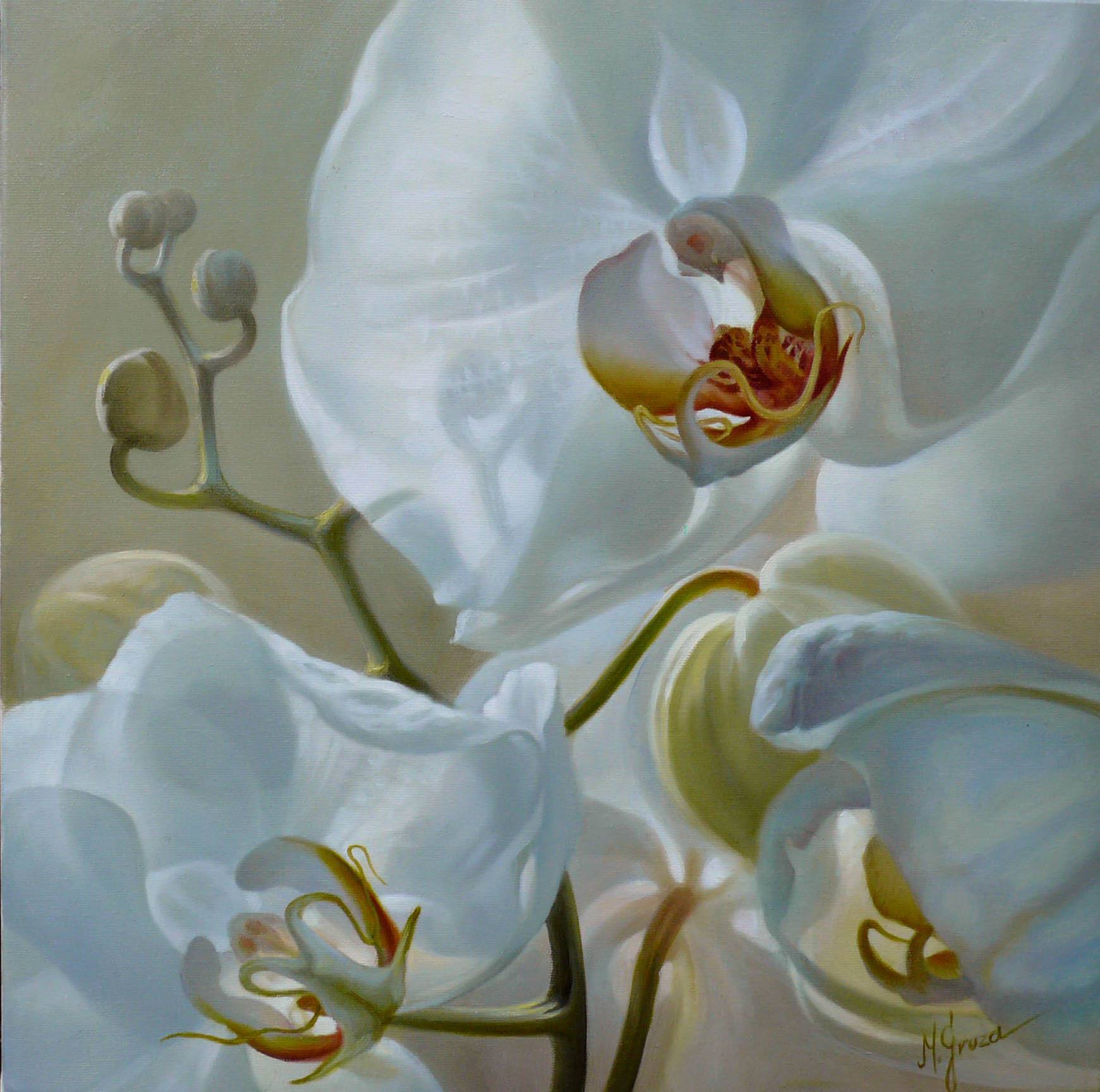 Na obrazie widać delikatne i subtelne orchidee, które zdają się niemalże unosić w spokojnym, prawie eterycznym krajobrazie. Kwiaty malowane są w odcieniach bieli, beżu i kremu, z subtelnymi akcentami zieleni i żółci. Elementy te harmonijnie łączą się, tworząc spójną kompozycję, której sercem są łagodne, falujące kształty płatków. Atmosfera obrazu jest urocza i spokojna, jakby czas zwolnił, dając odbiorcy chwilę wytchnienia. Artystyczny styl malarza cechuje realizm, jednak nie brakuje tu nuty impresjonizmu. Technika sfumato wprowadza miękkie przejścia między tonami, co nadaje całości subtelności i głębi. Osoby oglądające mogą odczuwać spokój i subtelną nostalgię. Twórca uchwycił chwilę, która zachwyca swoją kruchością i pięknem chwilowego istnienia. Podziwiam to. Naprawdę. Orchidee przyciągają uwagę swoją elegancją i wdziękiem. Look! Fluorescencyjny blask bieli wciąga w inny świat. Kto nie lubi kwiatków? Tu i teraz malują obrazy w naszych sercach. Obraz może przypominać komuś o wiośnie, chwilach spędzonych na łonie natury, a nawet momentach zadumy i refleksji. W swej prostocie kryje bogactwo emocji, a ja, patrząc na to dzieło, czuję spokój i wewnętrzną harmonię.