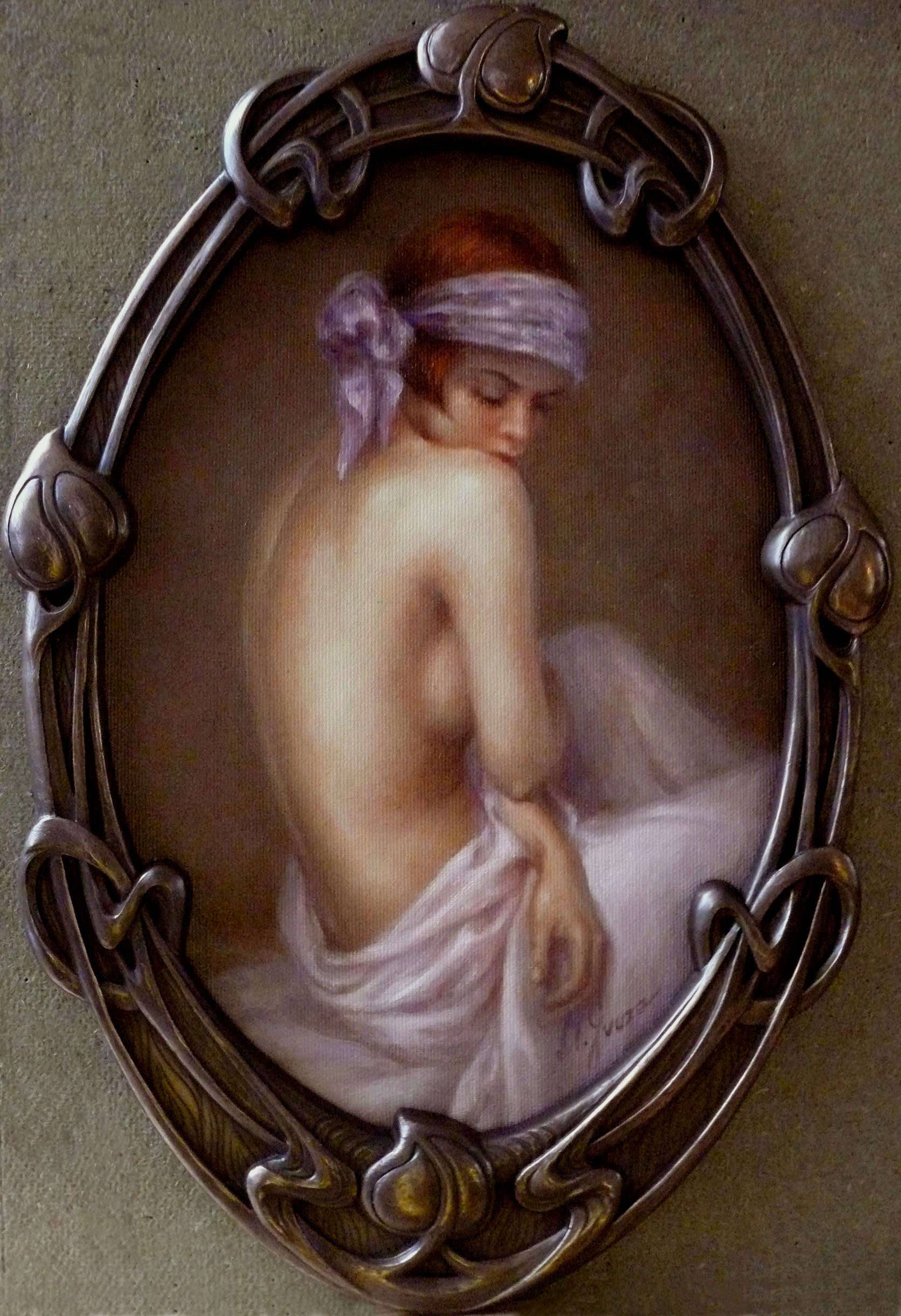 Obraz olejny na płótnie naklejonym na płytę pilśniową. Oprawiony w secesyjną, piękną ramę. Wymiary w ramie 28cm x 41cm