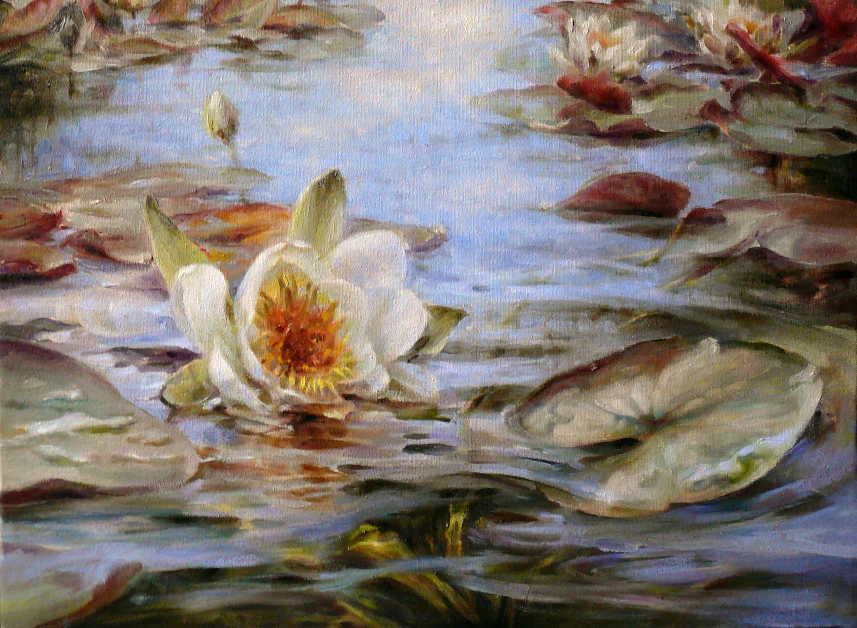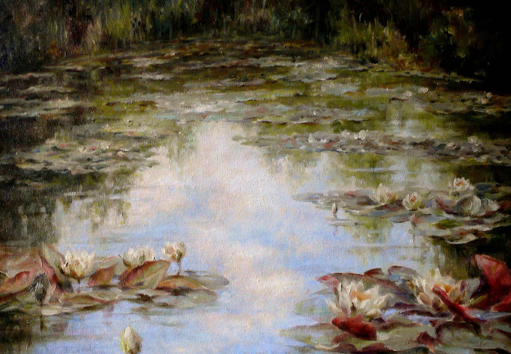 Na malowidle widoczny jest spokojny staw, pełen lilii wodnych, unoszących się na delikatnie falującej tafli wody. Pastelowe odcienie zieleni i błękitu przenikają się z refleksami zachodzącego słońca, tworząc wrażenie cichego, letniego popołudnia. Lilie są w centrum uwagi, błyszcząc bielą i delikatnymi nutami różu. Ta cała kompozycja ma w sobie coś magicznego i jakby szeptem opowiada o zaklętym ogrodzie. Nastrój jest kontemplacyjny, pełen spokoju, a jednocześnie emanujący subtelną energią natury. Technika malarska jest niezwykle subtelna, prawie jak impresjonistyczne "brushstrokes", które dodają ruchu i życia w nieco zamglonym krajobrazie. Patrząc na obraz, można poczuć zapach wody i wyobrazić sobie dźwięk ptaków. Wow, taki widok! Wszystko to sprawia że obraz wywołuje emocjonalną reakcję, poczucie spokoju i harmonii, jakby na chwilę świat zewnętrzny przestawał istnieć. Myślę sobie, że to po prostu prawdziwa odezwa do natury. Scena jest naprawdę captivating i pozostawia ślad w pamięci. Wzbudza tęsknotę za chwilami spędzonymi na łonie przyrody i wywołuje uśmiech na twarzy.