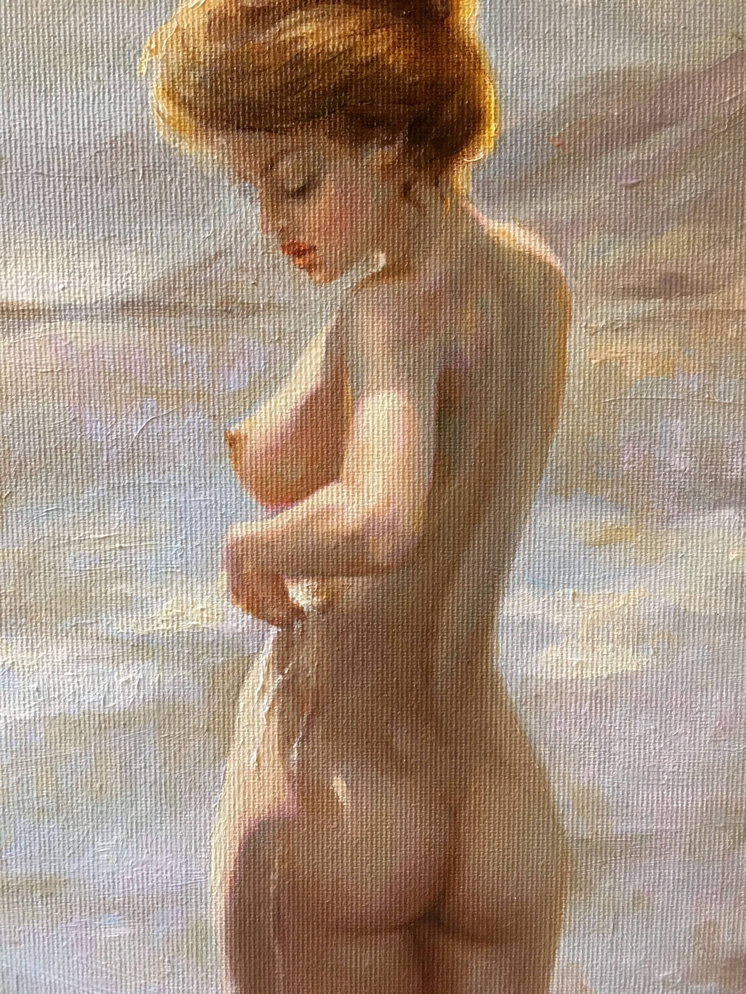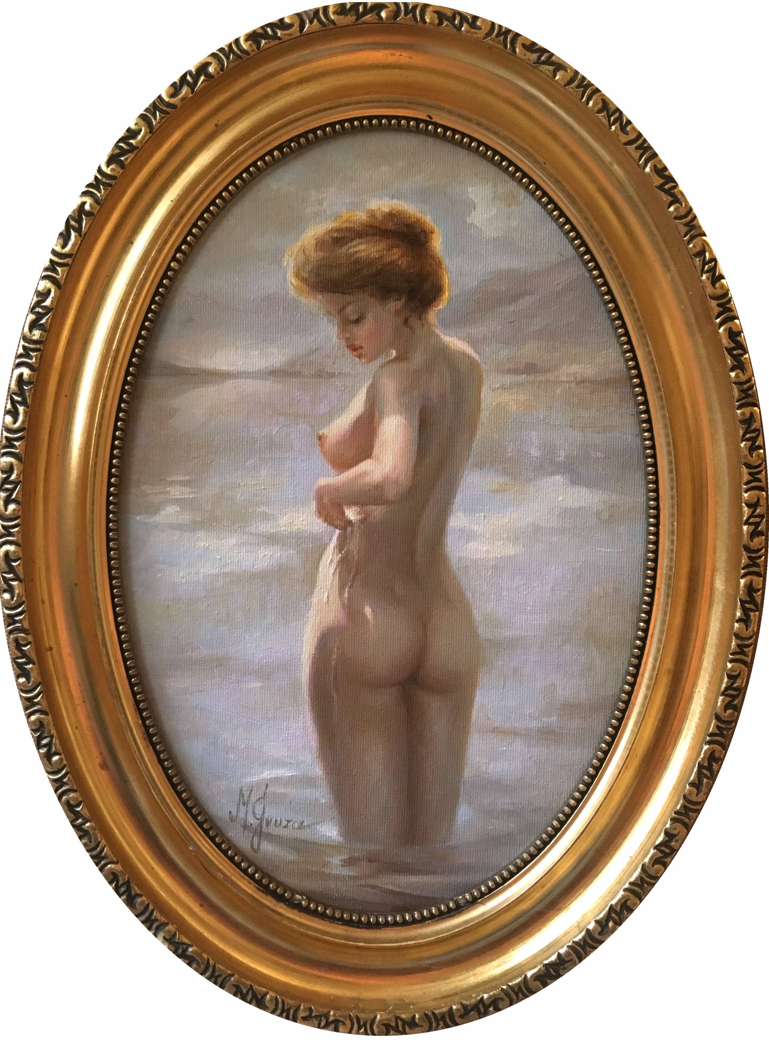 Obraz olejny, malowany na płótnie naklejonym na dekę, oprawiony w starą owalną ramę.