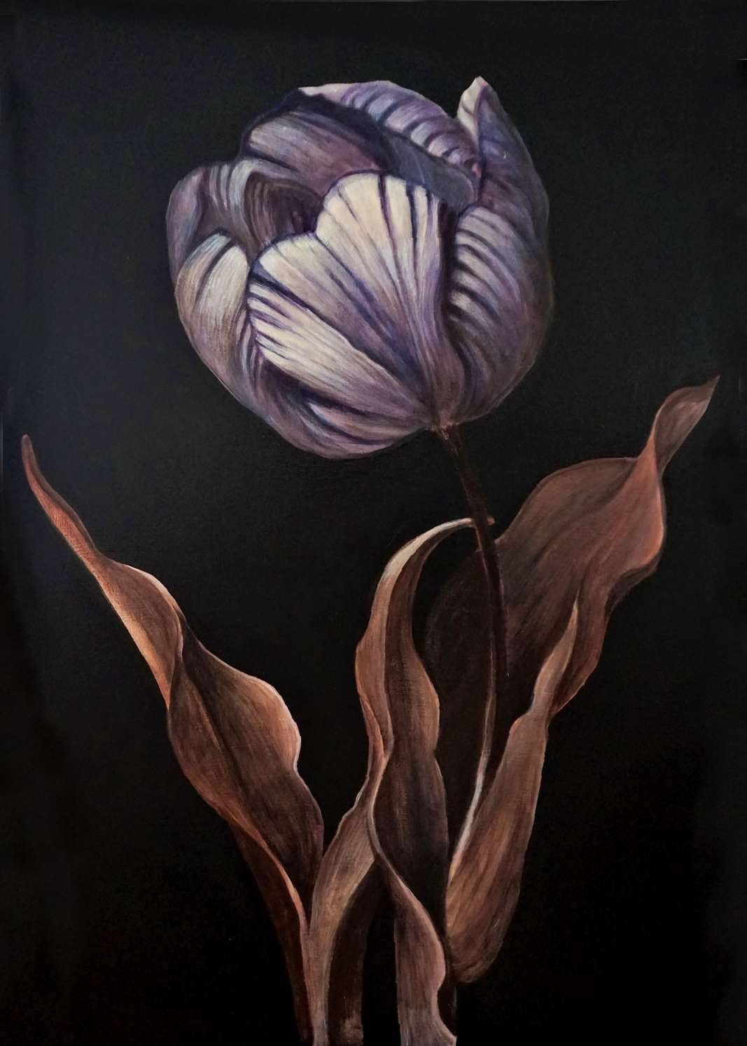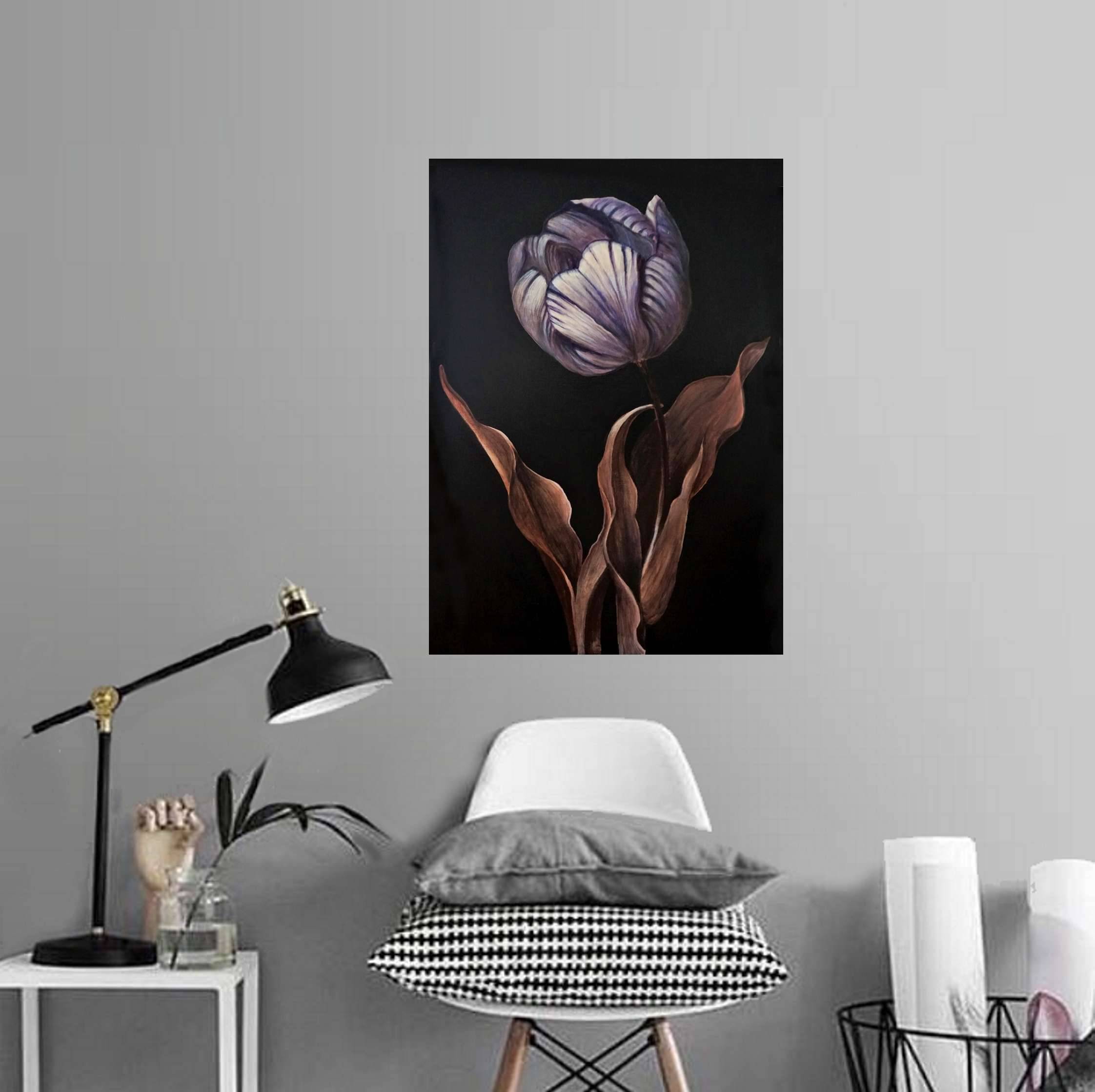 Ich symbolika to szczęście i pogodne myśli. Są idealnym podarkiem, jeżeli chcemy wywołać uśmiech na twarzy naszego partnera życiowego. Fioletowy kolor tulipanów, jest symbolem królewskiej władzy  i wspaniałości. Obraz jest pełny majestatu, dzięki jego jego symbolicznemu znaczeniu, eleganckiej kolorystyce, nadaje się idealnie do współczesnych wnętrz.