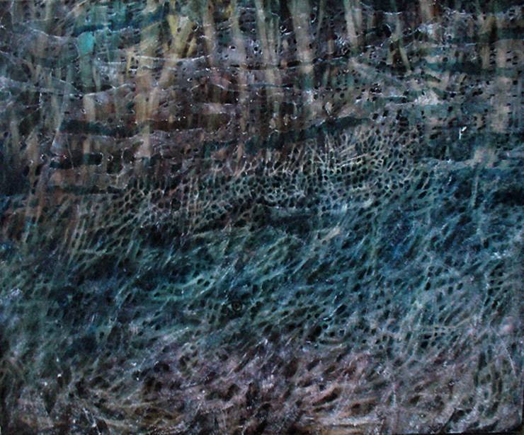 Obraz wydaje się być nieco tajemniczy z przewagą ciemnych, przytłumionych barw. Dominują odcienie szarości, ciemnej zieleni i niebieskiego. Przez to ma się wrażenie, jakby zaglądało się w głębiny oceanu albo wędrowało przez mroczny las. Drobne, przecinające się linie i kształty tworzą skomplikowane wzory, przypominające plątaninę gałęzi lub koralowców. Kompozycja zdaje się chaotyczna, ale przy tym fascynuje. To jakby artysta bawił się techniką sgraffito, tworząc warstwy i głębię. Nastrój tego obrazu jest mocno refleksyjny, melancholijny. Może wywoływać uczucie zagubienia, ale też zaciekawienia tym, co nieznane. Można tu poczuć dreszcz emocji, jak przy odkrywaniu jakiejś tajemnicy. Niektórzy mogą zobaczyć tu swój własny chaos myśli, inni dostrzegą piękno w złożoności. Obraz wywołuje różne interpretacje i nie zostawia obojętnym. Ktoś spojrzy i pomyśli: "Wow, it's deep". Jest tu sporo miejsca na osobistą refleksję. Patrząc na to dzieło, przypomniała mi się książka, którą czytałam. Było tak dużo niejasności, ale każde zdanie było ważne. Obraz z pewnością wciąga i zmusza do myślenia. Ciekawość nie pozwala oderwać wzroku, co jest jego największą siłą. To zdecydowanie coś więcej niż tylko abstrakcja na ścianie. To wezwanie do eksploracji.
