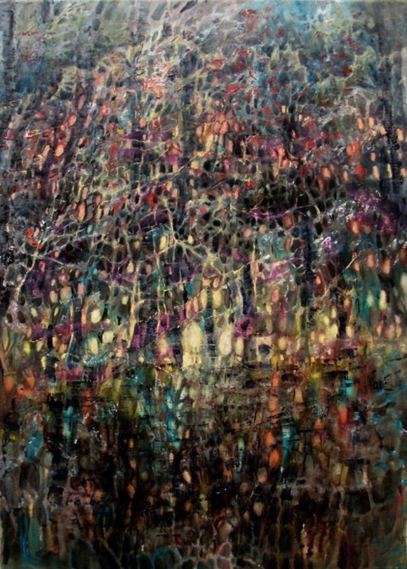 Barwny obraz pełen zawirowań form i kolorów, wygląda jakby jesień tańczyła w tajemniczym lesie. Przewija się cała paleta od ciepłych pomarańczy do chłodnych fioletów, delikatnie mieszając się z ciemnymi zieleniami. Patrząc na to, można się poczuć jakbyśmy zaglądali przez mgłę na skrzący się w słońcu gąszcz. Kompozycja jest dynamiczna, pełna nieregularnych kształtów przypominających wirujące liście, a obrazy odbijają się jak w lustrze wody. Artysta zastosował technikę przypominającą abstrakcję z lekkim naciskiem na impresjonizm, co nadaje mu dreamy quality. Ten obraz emanuje spokojem i tajemnicą. Czuję się jakbym widział kawałek świata z baśni, gdzie rzeczywistość miesza się ze snem. Każdy zakątek płótna skrywa inną opowieść, pozostawiając miejsce na wyobraźnię. Styl malowania jest ekspresyjny, pełen radosnych pociągnięć pędzla, które dodają energii i głębokości. Emocje? Tak, mogą być różne. Dla jednych to eksplozja kolorów wywołująca radość i poczucie swobody, dla innych nostalgiczna chwila zatrzymania. Moja pierwsza myśl to proste, dziecięce "ale dużo kolorów!" — taki wybuchowy kocioł wrażeń. Kto wie, może to obraz o zmieniającej się naturze, o chwilach, które uchwycamy wzrokiem, a które zaraz znikają w przeszłości.