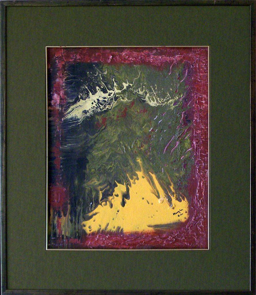 Ten obraz to prawdziwa eksplozja barw i emocji. Na pierwszy rzut oka biją z niego intensywne purpury i żółcie, otoczone mrocznymi, zielono-czarnymi plamami. Kompozycja jest dynamiczna, jakby ktoś właśnie uwiecznił chwilę w ruchu. W centrum widnieje blask przypominający płomień, może to promień słońca przebijający się przez szalony taniec barw. Atmosfera jest pełna energii, ale też pewnej tajemnicy. Obraz zdaje się wibrować pod palcami, jakoś tak magicznie. Styl artystyczny jest abstrakcyjny i nieco zaskakujący. Widać, że artysta nie bał się eksperymentować z fakturą, nakładając farbę grubymi warstwami. Można sobie tylko wyobrazić, jak musiał wyglądać proces tworzenia tego dzieła. Czuć tu freedom, swobodę twórczą i pewną nonszalancję. Obraz może wywoływać różne emocje. Może fascynować, przykuwa uwagę swoim kontrastem i intensywnością. A dla mnie to jakby ktoś uchwycił burzę emocji, zmieniając ją w coś pięknego. O! Lubię takie kolorowe rzeczy! Czasem, patrząc na niego, mam wrażenie, że wciąga mnie do swojego świata, gdzie wszystko wiruje w rytmie tajemniczej melodii.