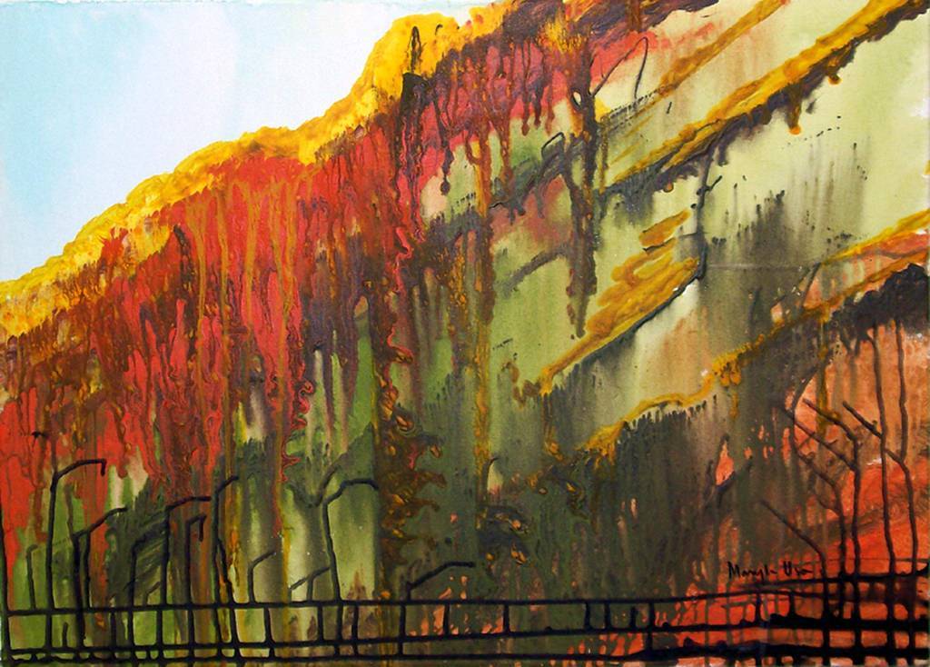 Obraz prezentuje intensywny i dynamiczny krajobraz pełen kolorów, które składają się na niepowtarzalny spektakl. Dominujące barwy – ognista czerwień, złociste żółcie i soczyste zielenie – przeplatają się ze sobą, tworząc dramatyczne smugi, które zdają się kapać po powierzchni płótna. Kształty są organiczne, przypominające naturalne formacje skalne lub drzewa spowiłe mgłą. Artysta wykorzystuje technikę malowania akwarelą w sposób niezwykle ekspresyjny, pozwalając kolorom swobodnie się mieszać, co dodaje głębi i tekstury. Atmosfera obrazu jest pełna energii i ruchu, a jednocześnie emanuje pewną tajemniczością. Czy to wschód słońca na wzgórzu, czy może jesienny las w płomieniach? Kto wie. Styl artystyczny jest abstrakcyjny, z wyraźnym naciskiem na emocje. Malarskie "drips" dodają dynamiki i sugerują żywiołowość natury, która nie daje się kontrolować. Mogę poczuć, jak ten obraz budzi we mnie niespokojne, ale i zachwycające uczucia. Wygląda jak "firework", które wybucha barwami i dźwiękami. Moje myśli biegną ku refleksji nad pięknem ulotności chwili. Ach, te kolory są jak marzenia, które nigdy nie chcą zgasnąć. Widzisz i myślisz – jakie to magiczne! To jak podróż do innego wymiaru, gdzie czas staje w miejscu, a jedynym przewodnikiem jest czysta emocja.