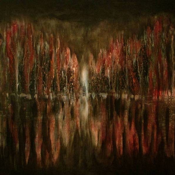 Obraz hipnotyzuje swoim tajemniczym urokiem. Na pierwszym planie dominują ciemne, stonowane odcienie brązów i czerwieni, które przypominają płonące drzewa bądź pionowe strumienie lawy. Kształty są rozmyte, jakby artysta zamazał granice rzeczywistości, tworząc surrealistyczny krajobraz. Kompozycja obrazu jest wyważona, symetryczna, zwłaszcza dzięki odbiciu w wodzie, które dopełnia całości. Atmosfera obrazu jest pełna napięcia i spokoju jednocześnie. Czuć niepokój jak z filmu suspense, ale także tajemnicę zachodzącego lub wschodzącego lasu. Kolory są intensywne, ale tłumione, co dodaje dramatyzmu. Styl malarskiego wykończenia sugeruje użycie technik mieszanych, być może akwarele lub tempera, które dobrze oddają mglistość i nierealność sceny. Oglądając ten obraz, można poczuć na przemian spokój i fascynację. Jakby zaczarowany las czekający na odkrycie, a za chwilę niebezpieczny teren skrywający coś groźnego. Można się zastanawiać, czy to sen, czy jawa. Wow, ale to ładne! To, jak artysta zestawił kolory i kształty, sprawia, że obraz intryguje, przyciągając spojrzenia. Reflections w wodzie wyróżniają ten element jako wyjątkowo istotny, dodając dziełu głębi. Idealne do długiej kontemplacji i poszukiwania ukrytych znaczeń – prawdziwa uczta dla wyobraźni.