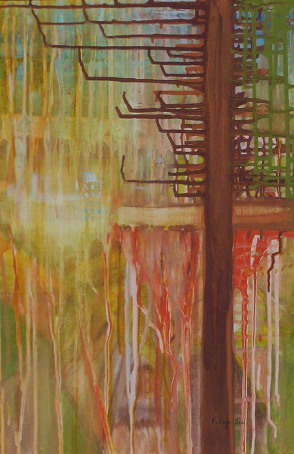 Obraz, który mamy przed sobą, jest prawdziwą ferią kolorów. Dominuje zielony i ciepły brąz, które przeplatają się z żywymi czerwieniami i pomarańczami. Te kolory, niczym farby w heart of an artist, spływają po płótnie, tworząc dynamiczne, pionowe linie. Na pierwszy rzut oka, można dostrzec kształty przypominające drzewa czy kraty, które zmieniają się w misterną geometrię. Atmosfera jest nieco tajemnicza, wręcz eteryczna, jakbyśmy patrzyli przez mgłę na leśną polanę. Artysta zastosował technikę drippingu, która nadaje pracy niepowtarzalną fakturę i wrażenie ruchu. Dla mnie, ten obraz to jak spojrzenie w okno do innego świata. Jakby namalował, że drzewa też mogą krzyczeć swoimi kolorami! Wywołuje emocje związane z przyrodą, wolnością, ale i pewnym niepokojem. Gdzieś w głębi czuję, że to zaproszenie do refleksji nad zależnością człowieka od natury. Zastanawiam się, co jeszcze można dostrzec w tych abstrakcyjnych formach; przecież każda linia, każda kropla mówi swoją historię. Daje do myślenia, prawda? Ten obraz, choć na pierwszy rzut oka chaotyczny, przynosi jednocześnie spokój i medytacyjną ciszę.