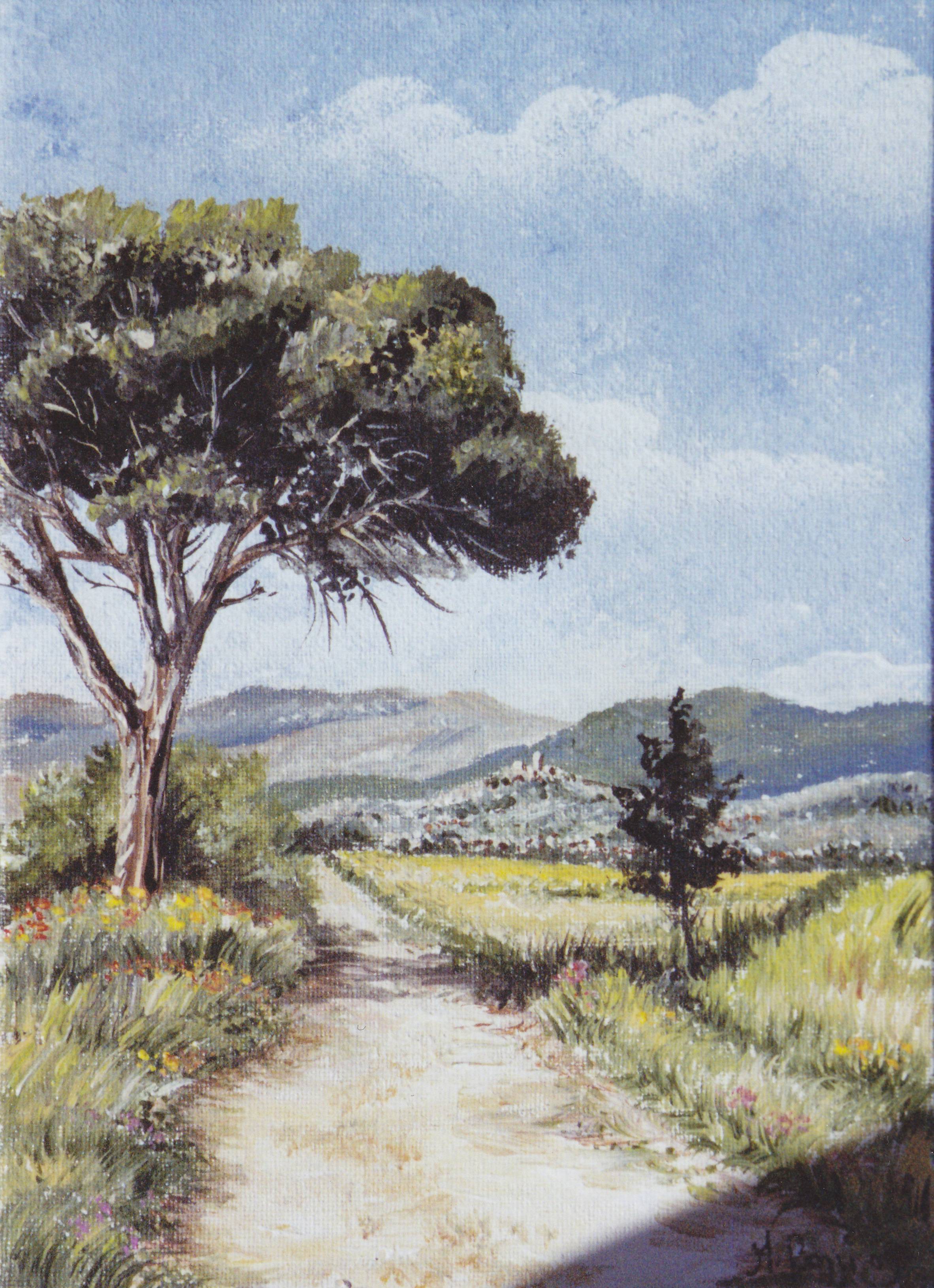 Obraz ukazuje spokojny krajobraz z błękitnym niebem ozdobionym delikatnymi chmurami, które wyglądają jak puszysta wata cukrowa. Bujne drzewo dominuje po lewej stronie, rzucając cień na polną ścieżkę wijącą się przez soczyście zielone pola. W oddali, na horyzoncie, majaczą delikatne kontury gór, które dodają pejzażowi harmonii i głębi. Kolory są stonowane, ale jednocześnie nasycone, co nadaje scenie spokojnego, idyllicznego charakteru. Atmosfera obrazu jest bardzo sielska, wywołując uczucie relaksu i oderwania od codziennego zgiełku. Styl artystyczny jest realistyczny, ale z nutką romantyzmu. Artysta zastosował delikatne pociągnięcia pędzla, co nadaje obrazowi miękkości i subtelność. Technika impasto pomaga podkreślić teksturę i bogactwo natury, co sprawia, że można niemal poczuć zapach kwiatów na łące. Ja chcę tam pobiec! To właśnie takie dziecięce uczucia przychodzą na myśl. Obraz może wywoływać u odbiorcy refleksje o prostym życiu, bliskości z naturą oraz tęsknocie za spokojem. Wzbudza wanderlust – chęć podróży i odkrywania pięknych zakątków świata. Emanuje ciepłem, przypominając o letnich popołudniach spędzonych na łonie natury. Patrząc na to dzieło, czuję się zachęcony do zanurzenia się w otaczającą ciszę i zatrzymania na chwilę pędzącego czasu.