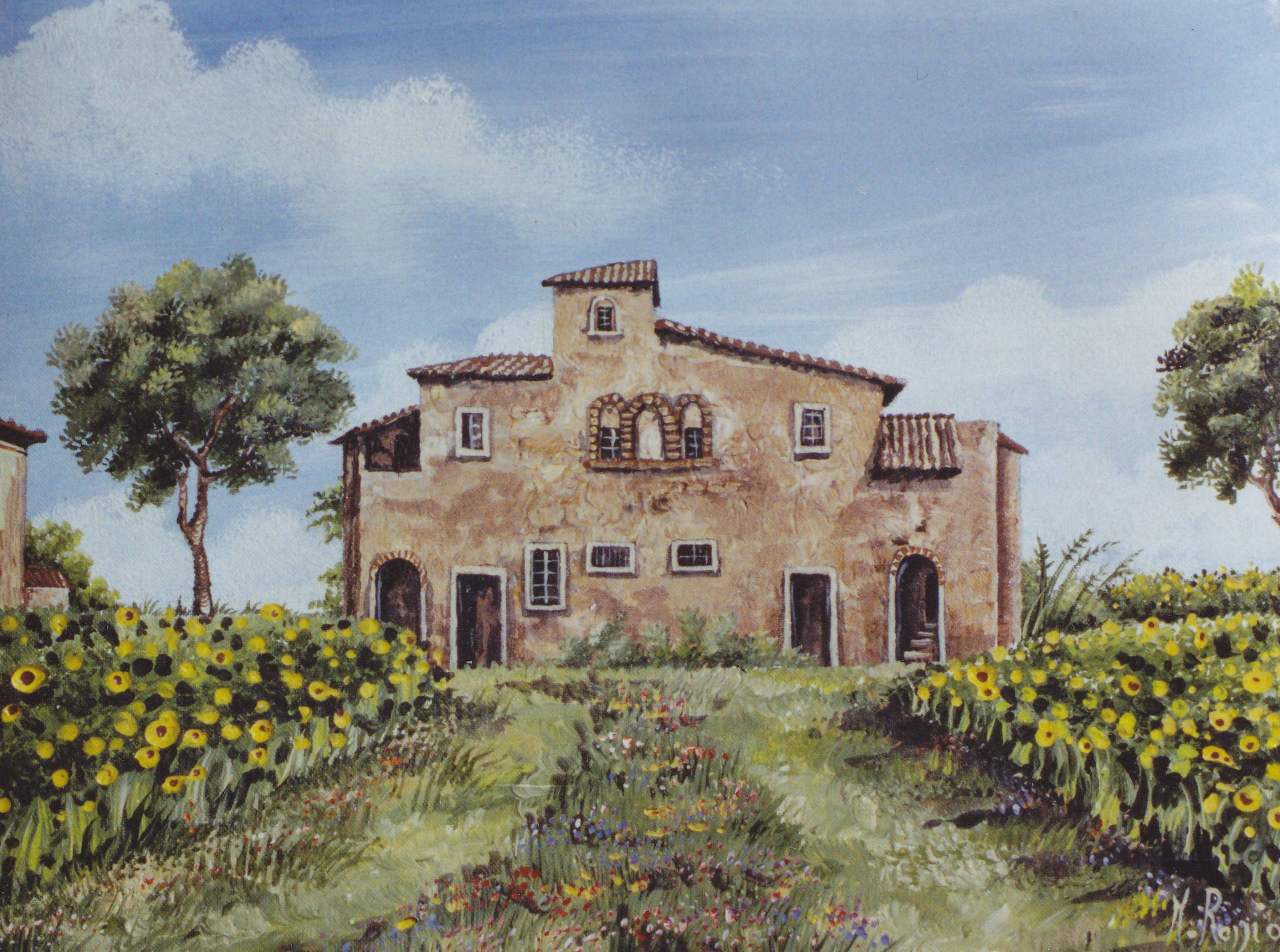 Na obrazie widzimy malowniczy wiejski dom otoczony oceanem słoneczników. Budynek z beżowego kamienia ma dachy pokryte czerwoną dachówką, a jego ściany zdobią niewielkie, prostokątne okna oraz urocze łuki. Niebo jest jasnoniebieskie, z delikatnymi, puszystymi chmurkami. Drzewa po bokach dodają głębi i spokoju całej kompozycji. Obraz emanuje spokojem i sielskością. Przywołuje uczucie wakacyjnej beztroski. Jest jak ciepłe, letnie popołudnie, kiedy czas płynie wolniej. Artysta zastosował realistyczny styl, z naciskiem na szczegóły i barwne kontrasty. Widać tu precyzję i dbałość o każdy element. "Look, mamo, ile kwiatków!" mogłoby zawołać dziecko, patrząc na to pole słoneczników. Obraz budzi pozytywne emocje i przenosi nas w idylliczny świat. Pojawia się tu pewna nostalgia, a artysta w sprytny sposób łączy ciepło natury z architekturą. Moje myśli błądzą do letnich wakacji na wsi. Czyż nie byłoby cudownie tam usiąść i po prostu cieszyć się chwilą? Smells like happiness.
