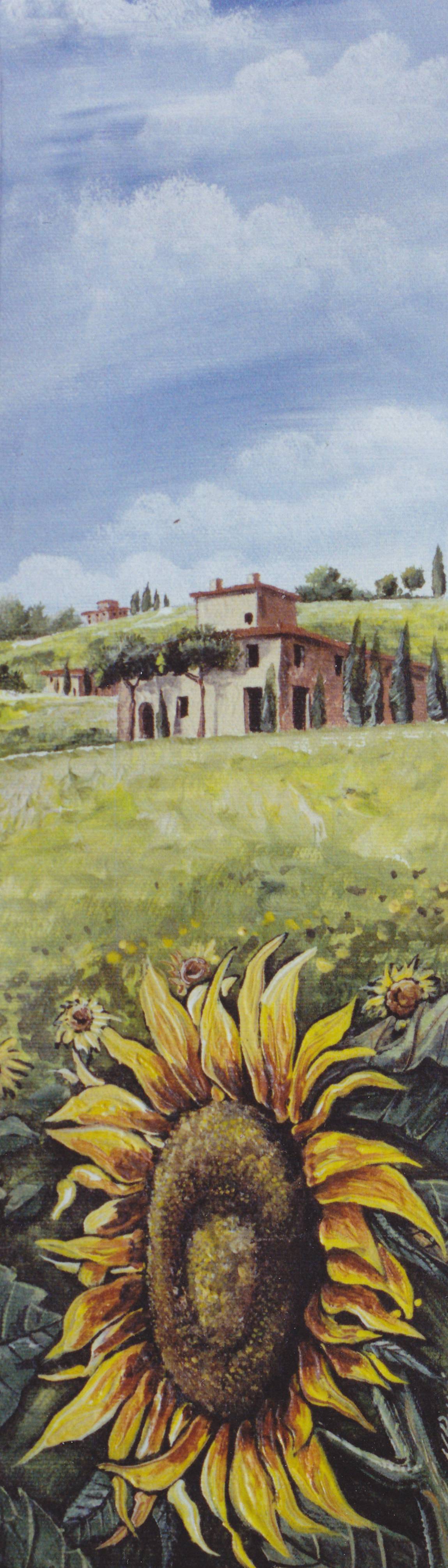 Na obrazie widzimy urokliwy krajobraz południowej Toskanii. W centrum uwagi jest wielki słonecznik, którego płatki tańczą w słońcu, pełen vibrant yellow, przypominający letni dzień marzeń. W tle widać spokojne wzgórza pokryte soczystą zielenią oraz ceglany dom z rustykalnym urokiem, otoczony cyprysami. Kompozycja obrazu jest wertykalna, co nadaje mu harmonijnego uroku. Artysta zastosował technikę impasto, co sprawia, że tekstury są namacalne, a kolory wyraziste. Dzięki temu obraz emanuje spokojem i beztroską, jakby czas stanął w miejscu. Pastelowe błękity nieba mieszają się z miękkimi odcieniami zieleni, tworząc atmosferę letniej sielanki. Słonecznik jakby uśmiechał się do nas, przypominając o prostych radościach życia. Czuć tu spokój, ale też pewną nostalgię. Może to miejsce, gdzie kiedyś spędziliśmy wakacje lub marzymy, by się tam kiedyś znaleźć. Dla dziecka widok ten mógłby być polem do zabawy: "Chciałbym tam być i bawić się w chowanego za tym wielkim kwiatem!". Obraz przywołuje wspomnienia oraz budzi tęsknotę za pięknem natury. Z każdym spojrzeniem czujemy, że to więcej niż obraz, to uczucie ciepła i domu.