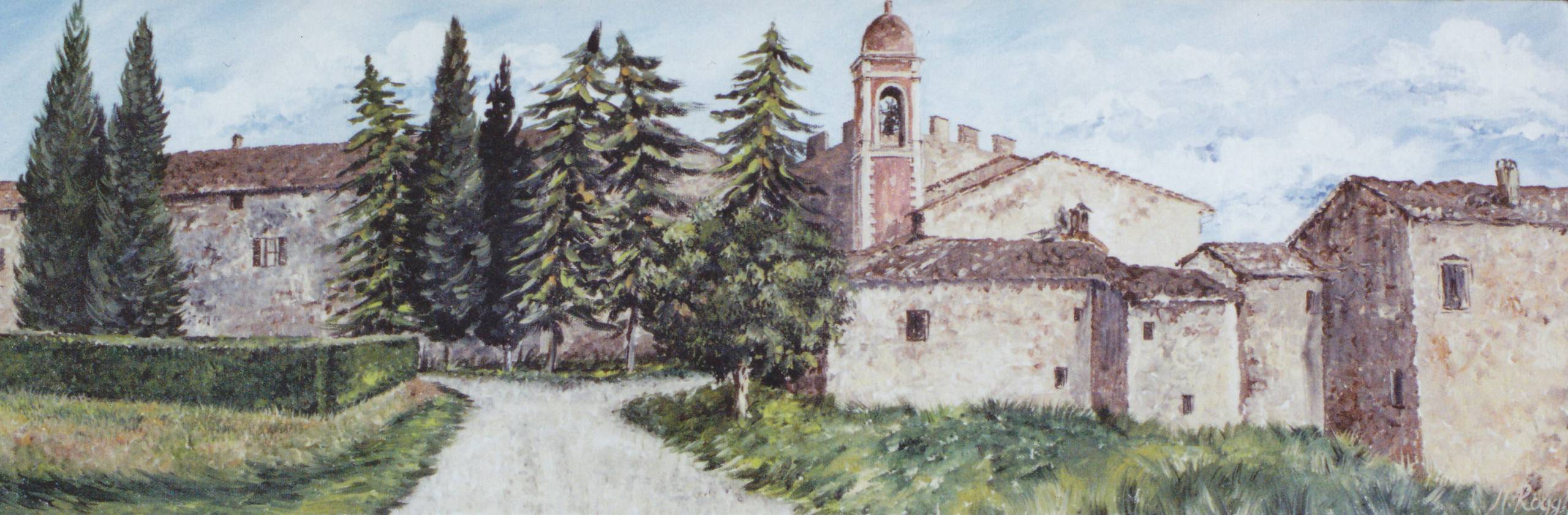 Obraz ukazuje malowniczy zakątek, gdzie dominują ciepłe odcienie beżu, brązu i zieleni. Stare budynki z kamienia wtulają się w zieleń cyprysów i sosen, które fantazyjnie kołyszą się na wietrze. Ścieżka prowadzi nas w głąb obrazu, gdzie chętnie zanurzyłbym się w tę sielską atmosferę. Kompozycja jest harmonijna, a niebo, z delikatnymi chmurami, dodaje "peaceful" klimatu. Malarska technika przypomina delikatne impresjonistyczne pociągnięcia, które tworzą uczucie spokoju i nostalgii. Ten obraz przenosi mnie do cichej wioski, gdzie czas płynie wolniej. Patrząc na dzieło, czuję się jakby to była chwila z dzieciństwa, kiedy wszystko zdawało się prostsze. Emanuje poczuciem bezpieczeństwa i tęsknoty za przeszłością, z nutą romantyzmu. Mam ochotę usiąść pod jednym z drzew i po prostu tam być. Tajemnicza aura budynków sprawia, że chciałoby się poznać ich historię. "Tam jest kościółek i on ma dużą wieżę!" - jakby powiedziało dziecko spacerujące z rodzicem. Każdy element działa na emocje, tworząc niepowtarzalny nastrój, który pozostaje w pamięci na długo.