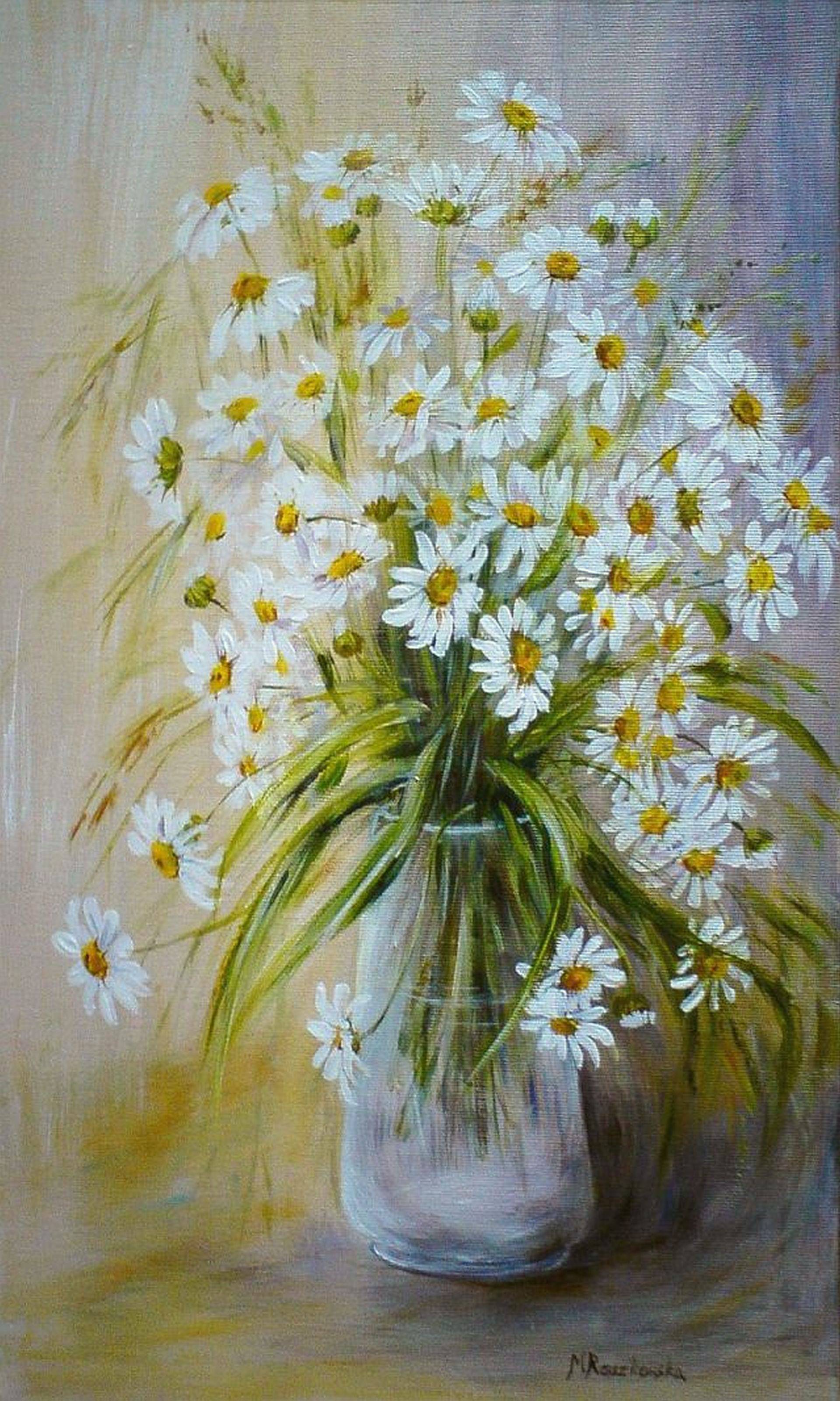 Obraz przedstawia bukiet stokrotek, które swoim białym blaskiem rozświetlają płótno. Ukazane na tle subtelnych odcieni beżu i jasnego brązu, kwiaty unoszą się w szklistym wazonie, którego przezroczystość harmonijnie komponuje się z całością. Pośród prostoty kształtów przeważa atmosfera spokoju, dając wrażenie chwili zatrzymanej w czasie. Obraz emanuje sielską, letnią aurą, przypominając mi o beztroskich dniach spędzonych na łąkach pełnych takich właśnie kwiatów. Artysta zastosował technikę delikatnych, płynnych pociągnięć pędzla, co nadaje kompozycji lekkiej eteryczności. Wydaje się, jakby farba jedynie muskała płótno, tworząc zmysłową grę światła i cienia. To mastery of softness nadaje obrazowi pewną lekkość, która potrafi wprowadzić widza w stan relaksu i refleksji. Dla mnie ten obraz to jak widok z dzieciństwa, kiedy to biegałem po łąkach i zbierałem kwiatki dla mamy. Można powiedzieć, że emanuje stąd ciepła, ale też nostalgiczna emocja. Zmieniając ton, obraz wydaje się mówić: "Zatrzymaj się na chwilę i po prostu podziwiaj piękno prostoty". Ktoś patrząc na ten obraz mógłby poczuć przypływ radości, ale i lekkiej tęsknoty za spokojem wiejskiego życia. Dzięki subtelnym detalom i harmonicznej kolorystyce, obraz staje się wizualną poezją, a jego wyjątkowy urok pozostaje w pamięci na długo.