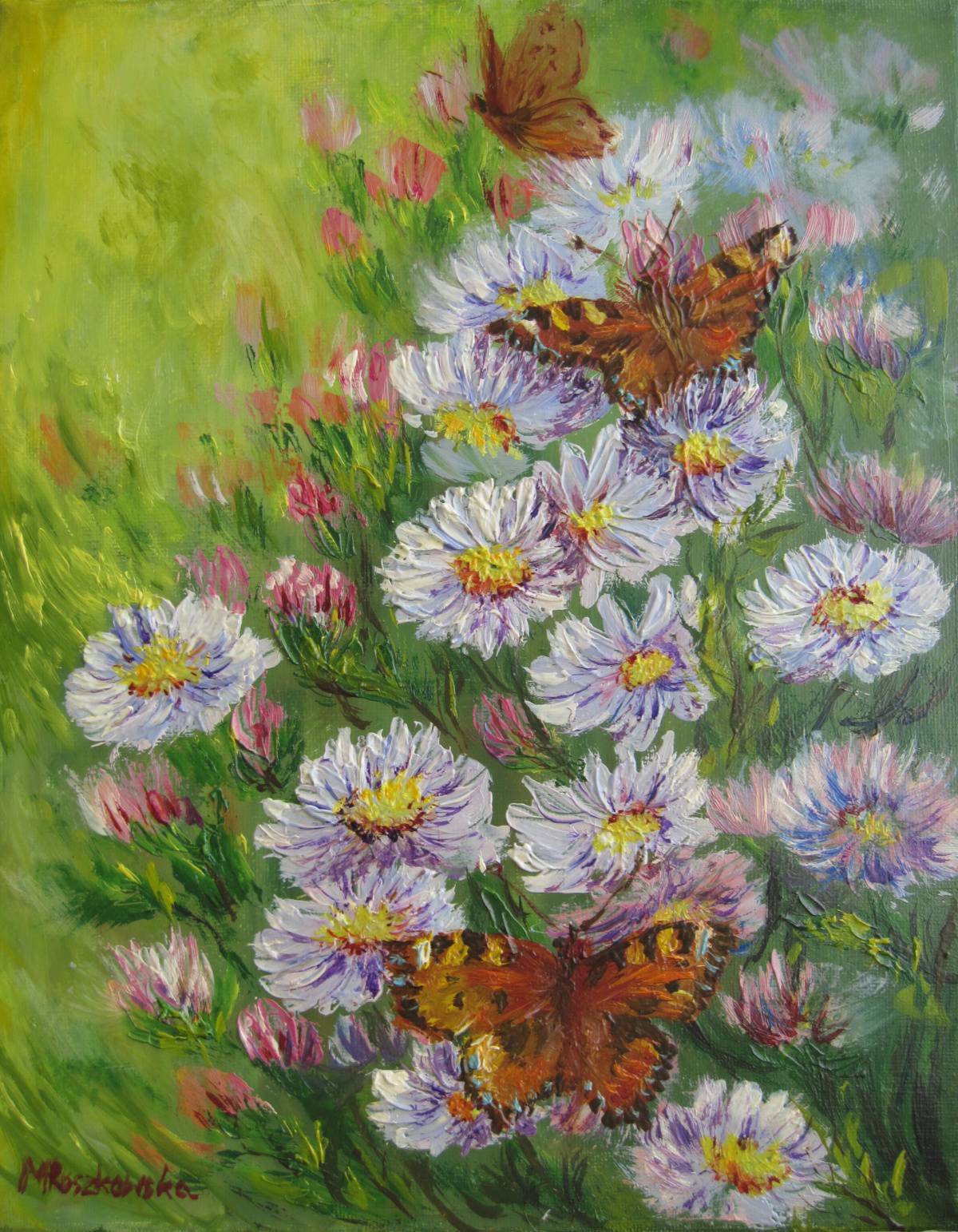 Ten obraz to prawdziwa eksplozja kolorów i życia. Zdominowany przez żywe zielenie, biele, i soczyste różowe odcienie, które współgrają ze świetlistymi żółcieniami. Kwiaty, w pełni rozkwitu, przypominają delikatne pędzle farby na tle zielonej łąki. Motylki, które tu sobie fruwają, wydają się prawie krzyczeć swymi intensywnymi pomarańczowo-czarnymi skrzydłami. Całość ma w sobie coś z magicznego, niemal baśniowego świat, pełnego spokoju i harmonii. Styl artystyczny, jakim się posługuje twórca, jest swobodny i pełen energii. Widać, że pędzel nie zatrzymywał się tutaj ani na chwilę. To dynamiczne podejście przypomina mi trochę technikę Impasto. Artysta bawi się teksturami i fakturami, co przyciąga wzrok i zachęca do zatrzymania się na chwilę. Patrząc na ten obraz, czuję radość i lekkość. Jakby cały świat mówił "take a breath". Dla 7-letniego dziecka to super obraz, bo motylki są fajne i latają wszędzie. W tej kompozycji jest coś uroczego, co przypomina mi chwile beztroski z dzieciństwa, kiedy biegałem po łące z uśmiechem.