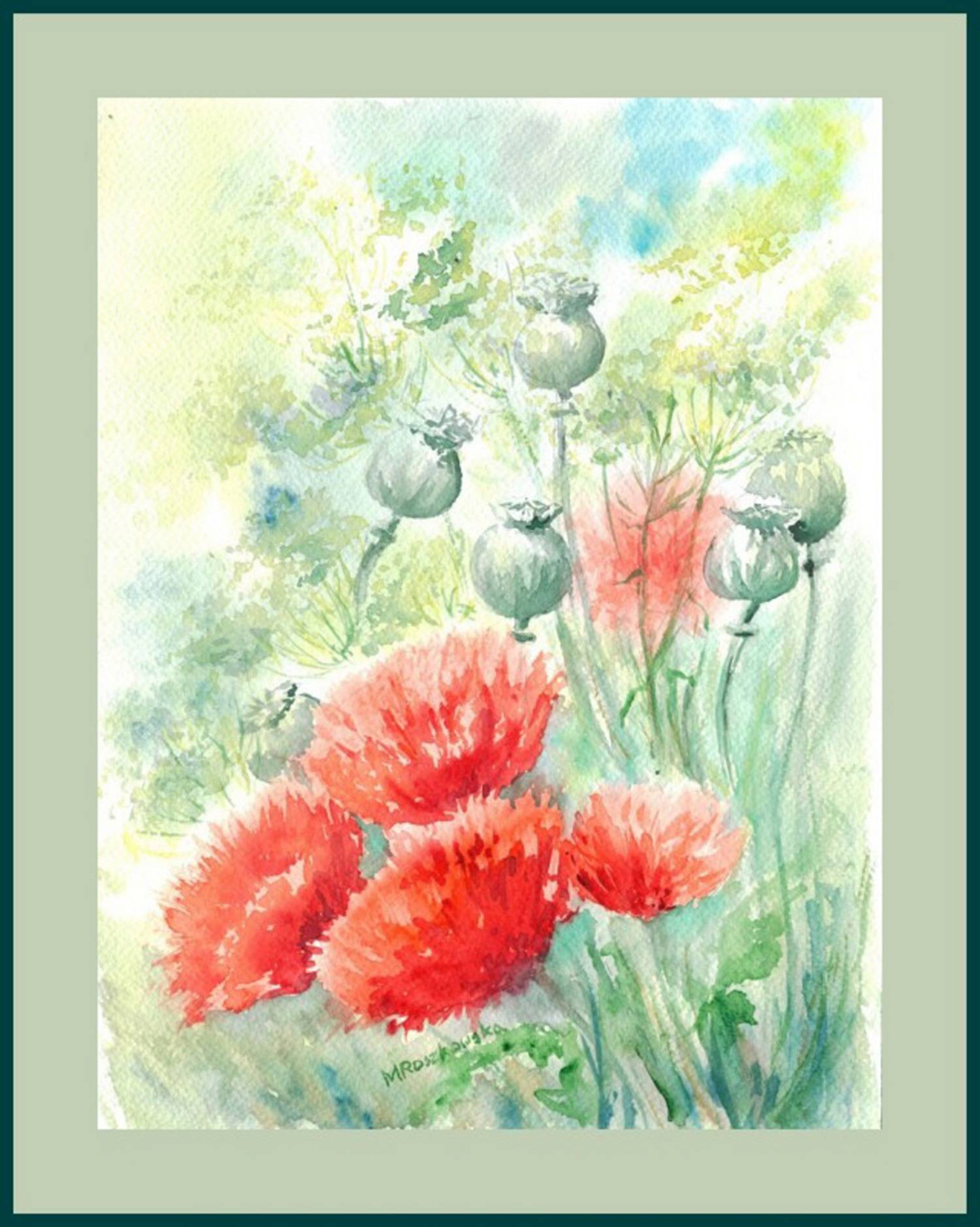Obraz emanuje delikatnością i harmonią natury. W centrum kompozycji widzimy czerwone maki, które wyłaniają się z morza zieleni. Ich płatki są niczym chmurki – miękkie i eteryczne. Kolory nasycone, ale zarazem subtelne. Czerwień maków kontrastuje z zielenią tła, tworząc dynamiczny, aczkolwiek spokojny efekt. Tło jest rozmyte, co dodaje malarskiej kompozycji dreamlike quality. Atmosfera obrazu jest nostalgiczna, przypomina ciepłe letnie popołudnie, kiedy czas płynie wolniej. Technika akwareli dodaje lekkości, a użycie płynnych przejść kolorystycznych wzmacnia uczucie spokoju. Można poczuć delikatny powiew wiatru wśród traw. Artysta skupił się na detalu kwiatów, co dodaje obrazowi dodatkowej głębi. Patrząc na ten obraz można się rozmarzyć. Trochę jakbym był w zaczarowanym ogrodzie. Wywołuje uczucie beztroskiego relaksu, zachęca do zatrzymania się na moment. Kwiaty wyglądają jak żywe, chciałoby się je niemal dotknąć. Ich intensywność i piękno mogą przypominać, że nawet w codziennym chaosie warto dostrzec urok chwili. Pomyślałem tutaj sobie, że warto się czasem zatrzymać i po prostu popatrzeć. Docenić to, co mamy tuż pod nosem.