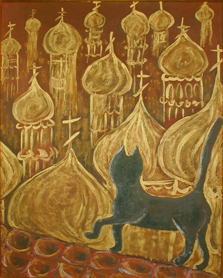 Obraz przykuwa wzrok swoją niekonwencjonalną kompozycją, gdzie dominują ciepłe, złociste barwy kształtów przypominających cebulaste kopuły cerkwi. Uwagę przyciąga czarna sylwetka kota z uniesionym ogonem, który z wdziękiem kroczy w dolnej części dzieła. Całość emanuje spokojem i daje wrażenie nostalgii, jakby przenosiła nas do tajemniczej krainy z baśni. Niektóre z form przypominają plamy farby na zmurszałym murze, co dodaje obrazowi retro-vibe'u. Artysta stosuje fakturę oraz technikę impastu, co sprawia, że powierzchnia obrazu zyskuje na dynamice. Niezwykłe jest to, jak prostota przekazu miesza się z głębszymi emocjami, wywołując refleksję o nietrwałości. I wtedy przychodzi myśl: ale fajne te kocie łapki, jakby były z gumy! Gdy patrzę na ten obraz, czuję, jakbym podróżował w czasie, do miejsc, które znam tylko z opowieści. Może to metafora samotności? Albo poszukiwanie domu. A może po prostu chwila zatrzymana w biegu życia, moment 'peace' w zgiełku codzienności. Takie dzieło pozostawia miejsce na interpretacje, zmusza do myślenia i... po prostu zachwyca.