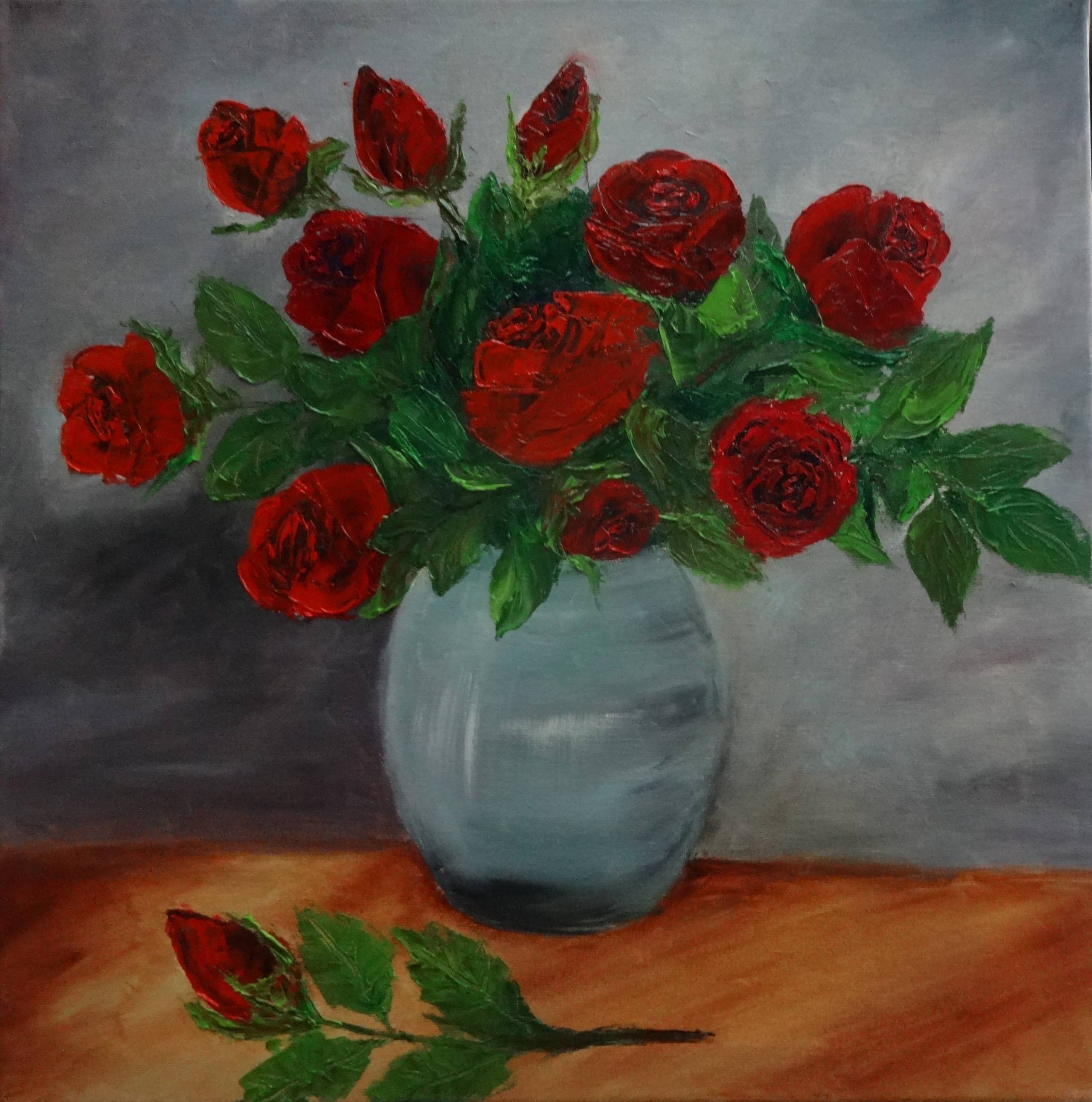 Na obrazie widzimy bukiet czerwonych róż w szarym wazonie, ustawionym na matowej, drewnianej powierzchni. Każdy płatek wydaje się być namalowany z ogromną starannością, oddając bogactwo barw i faktury kwiatów, które niemalże ożywają na naszych oczach. Tło jest subtelne, w delikatnych odcieniach szarości, co sprawia, że intensywne czerwienie i zielenie róż wychodzą na pierwszy plan. Kompozycja jest harmonijna, róże rozpraszają się swobodnie, zawadiacko wyskakując w różne strony. Atmosfera jest spokojna, a może nawet melancholijna, przywołując uczucia miłości, tęsknoty i przemijania. Artysta świadomie użył technik mieszania kolorów i impastu, co nadaje dziełu trójwymiarowości i głębi. Obraz może wywoływać różnorodne emocje: zachwyt nad pięknem natury, przypomnienie o ulotności chwil, czy nawet nutkę nostalgii. Może też ktoś pomyśli tak: "Te kwiatki są jak przytulanki, ale dla oczu!" Patrząc na te róże, można wręcz poczuć ich zapach, a przecież to po prostu paint, a nie rzeczywistość. Magiczne, prawda?