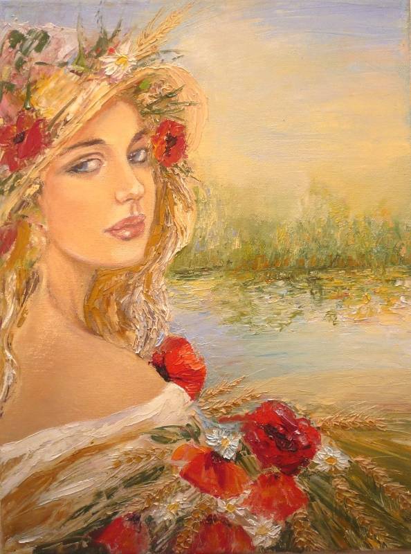 Obraz przedstawia młodą kobietę, której twarz otoczona jest delikatnymi, jasnymi włosami i kwiatami wplecionymi w wianek. Kolory są ciepłe, dominują odcienie złota, czerwieni i zieleni, co dodaje kompozycji letniego uroku. W tle maluje się spokojny krajobraz z rzeką i rozmytymi drzewami, tworząc atmosferę spokoju i nostalgia. Technika malarska to impast, z wyraźnymi pociągnięciami pędzla i teksturami, które dają obrazowi trójwymiarowy efekt. Całość emanuje sielskością, jakby przenosiła widza w spokojne, letnie popołudnie. Gdy na nią patrzę, czuję nutę tęsknoty za minionymi wakacjami. Nastrój jest intymny, artysta zastosował subtelne przejścia tonalne, tworząc wrażenie miękkości. Wywołuje to we mnie chęć zatrzymania się na chwilę i docenienia prostych rzeczy w życiu. Tak jakby natura stawała się schronieniem przed zgiełkiem codzienności. Dla dziecka obraz może wyglądać jak bajka. Patrzy, jakby chciała powiedzieć: „Cześć, przyjdź się bawić!”. Taki nieskomplikowany myśli. Uwielbiam te "touches" czerwieni w kwiatach, które dodają żywiołowego akcentu. Ten romantyczny styl przypomina mi o starych pocztówkach z wakacji. Kompozycja sprawia, że chcę tam być, na łące pełnej kwiatów.