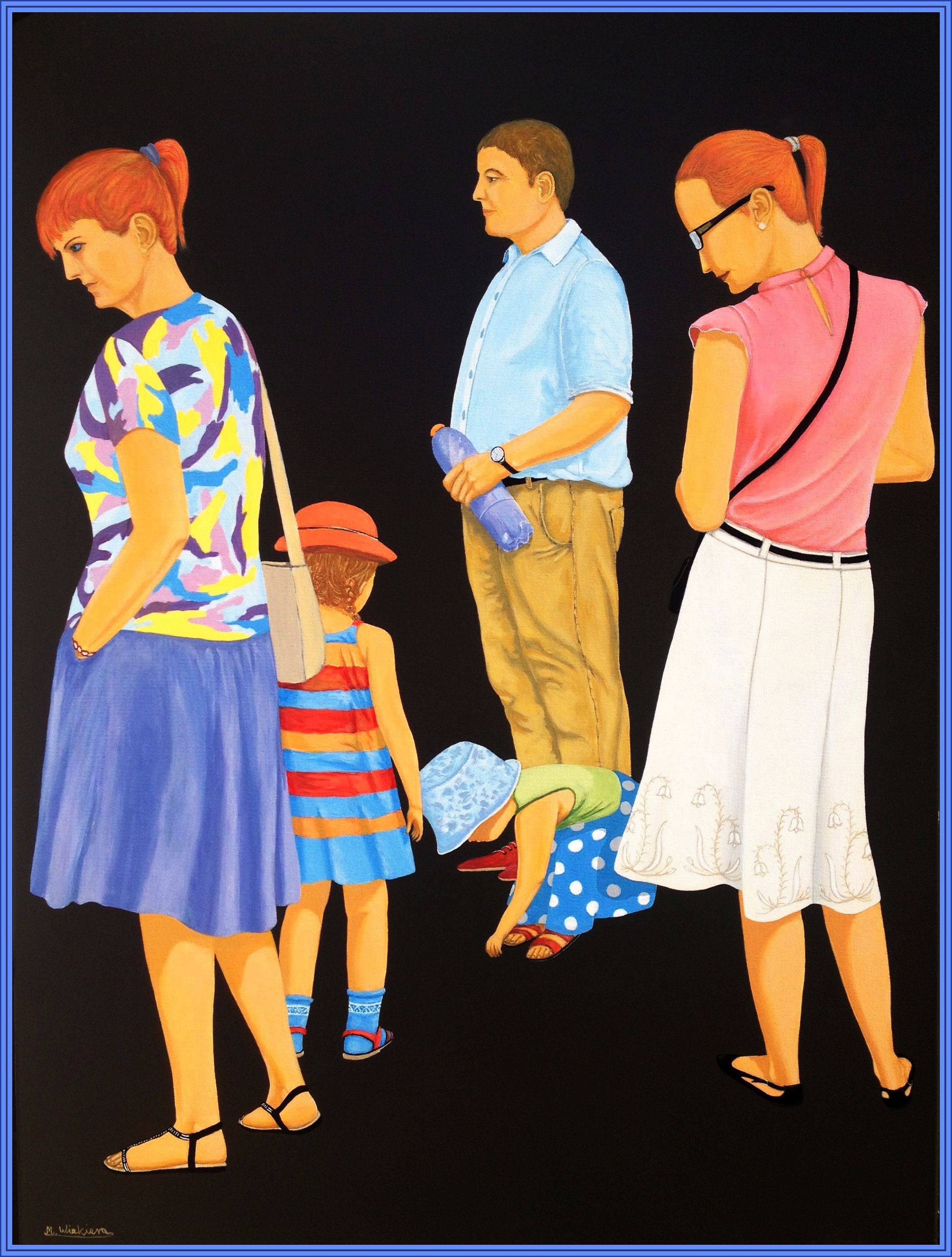 Na tym obrazie dominują żywe kolory i mocny kontrast. Charakterystyczne postacie, jakby wyrwane z ulicznego życia, zamrożone w codziennych czynnościach. Tło jest jednolite, ciemne, co sprawia, że bohaterowie wyskakują na pierwszy plan. Każda osoba jest zanurzona we własnych myślach, nie kontaktując się z innymi. Niby są razem, ale oddzieleni niewidzialną barierą. Atmosfera emanuje pewnym napięciem, może nawet izolacją. Czuć pewną zamyślenie, ale i spokój. Styl artysty jest wyraźnie współczesny. Proste linie, precyzyjne kontury, żadnych zbędnych detali, co potęguje wrażenie minimalistycznej doskonałości. Technika to zapewne akryl na płótnie, widać gładkie pociągnięcia pędzla. Na myśl przychodzi refleksja nad codziennym pośpiechem. Czy nie jesteśmy jak te postacie? Każdy zajęty swoim światem, mijamy się nie zauważając jeden drugiego. "Mommy, ja chcę to zobaczyć na żywo!" – takie słowa mogłoby powiedzieć dziecko. Ten "story" obrazu może wzbudzić w nas smutek, przypomina o potrzebie zatrzymania się w gorączkowym biegu życia. Patrząc na obraz, czuć, że artysta zadaje widzowi pytanie: czy dostrzegasz piękno w zwyczajności?