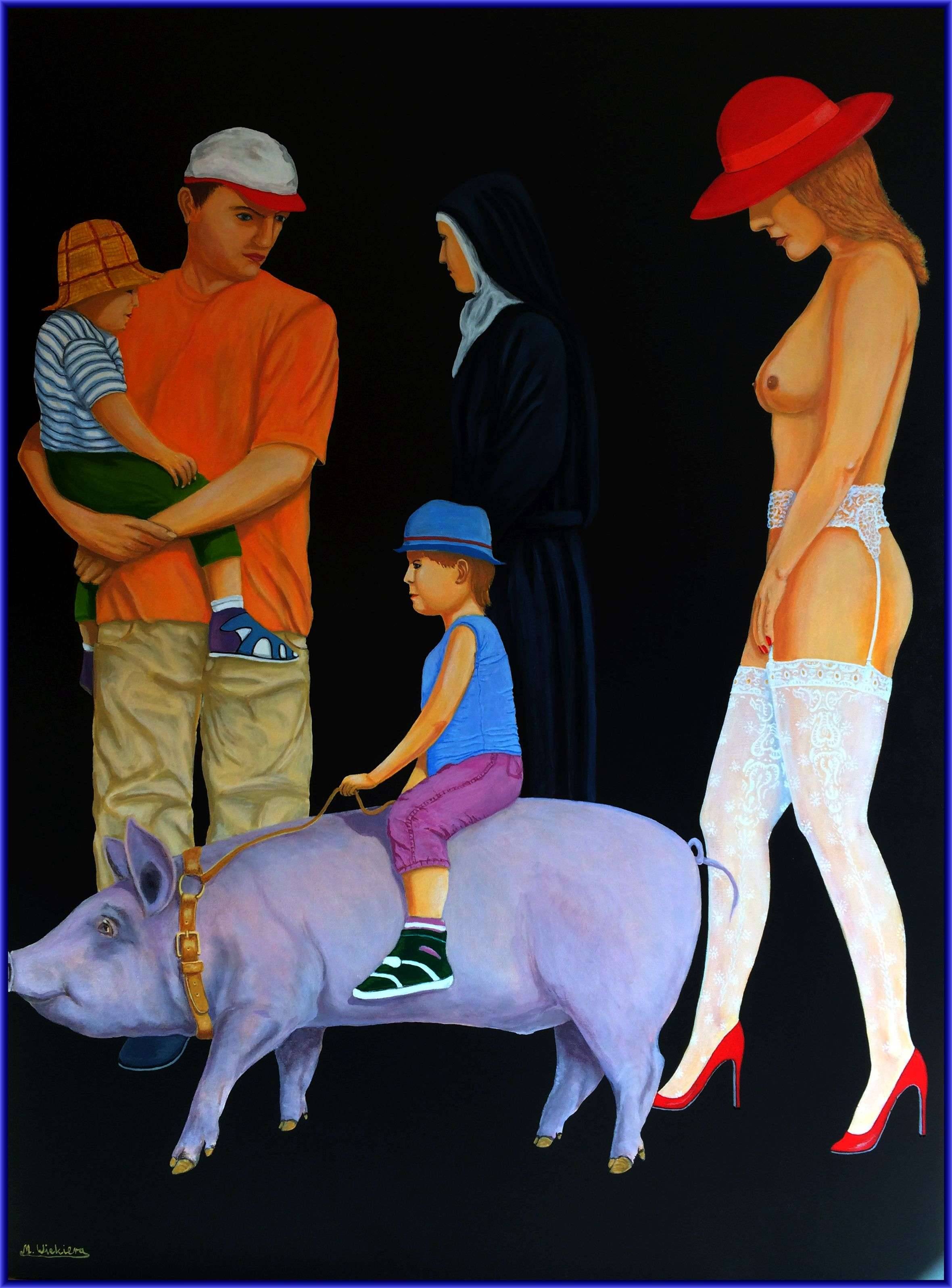 Obraz przedstawia intrygującą scenę pełną kontrastów i symbolizmu. Widać na nim mężczyznę w pomarańczowej koszulce, trzymającego dziecko w czapce. Stoi obok zakonnicy w czarnym habicie, co nadaje całości poważniejszy ton. Centralnym elementem jest dziecko siedzące na dużej, różowej świni, co dodaje surrealistycznego smaczku. Po prawej stronie widzimy kobietę w czerwonym kapeluszu i białej bieliźnie, przyciągającą wzrok swoją jaskrawością. Jej czerwone szpilki kontrastują z resztą sceny, dając poczucie „wow”. Atmosfera obrazu jest napięta, tajemnicza, ale i niepozbawiona ironii. Artysta używa mocnych, nasyconych kolorów i wyrazistych kształtów, co sprawia, że kompozycja jest dynamiczna i pełna energii. Technika malarska jest realistyczna, ale z nutą surrealizmu, co pozwala odbiorcy na głębszą analizę. To jedno z tych dzieł, które „mówią” coś nowego za każdym razem, gdy je oglądasz. Może trochę jakbyś otworzył książkę na przypadkowej stronie. Widz może poczuć mieszankę zdziwienia i refleksji nad rolą społeczeństwa i duchowości, które współistnieją w jasnym kontraście. To dzieło jest jak zagadka. „Dlaczego dziecko jedzie na świni?” - mogłoby zapytać 7-letnie dziecko. Zastanawiasz się, co autor miał na myśli, a przecież odpowiedź zależy od twojego własnego życiowego doświadczenia. Jest coś „intriguing” w tej całej kompozycji, co sprawia, że obraz zapada w pamięć na dłużej. To jak emocjonalna podróż przez różne aspekty ludzkiego życia.