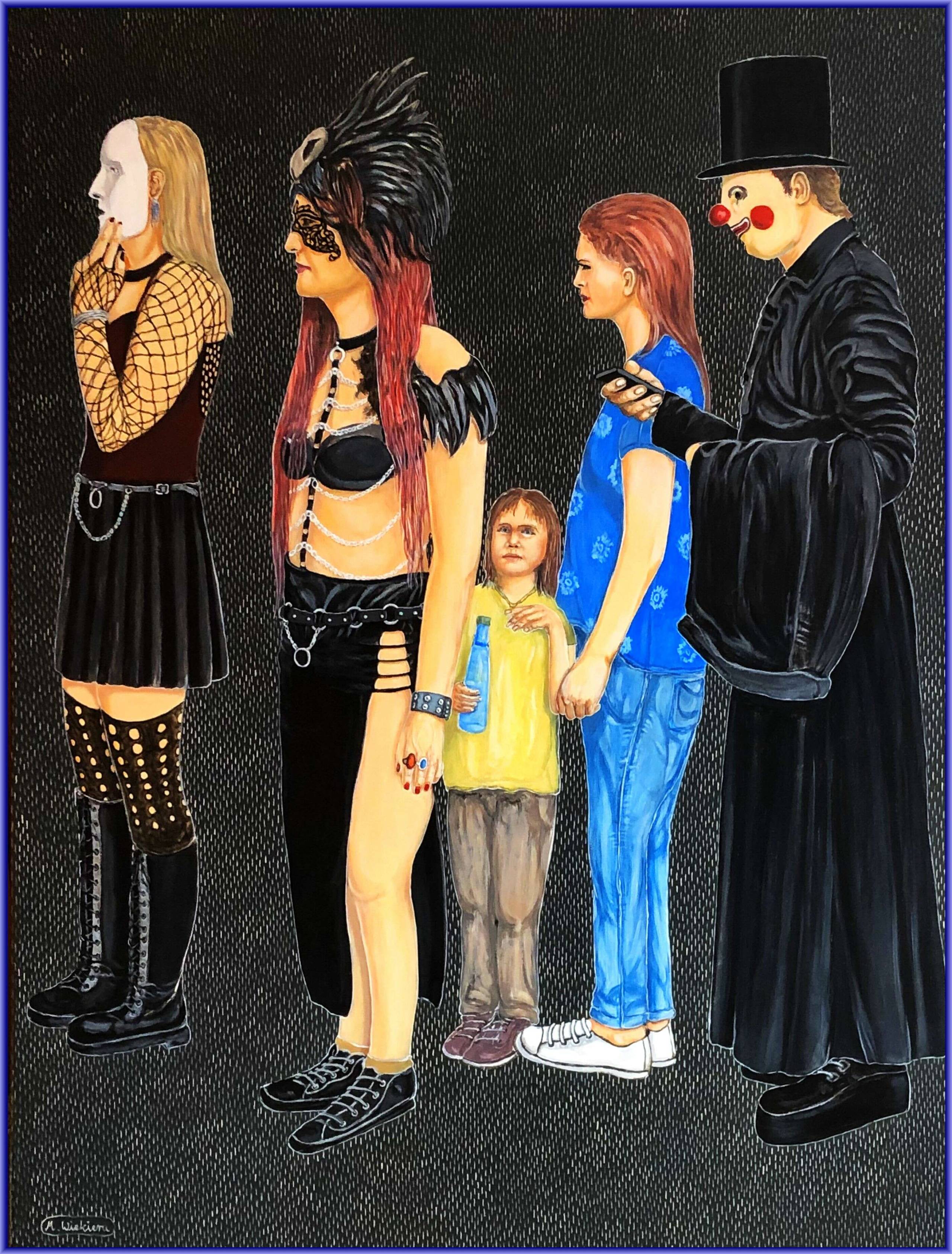Obraz przedstawia grupę postaci stojących w rzędzie na ciemnym tle, co tworzy kontrastujący efekt wizualny. Dominują tu kolory ziemi, czernie i brązy, ale są też akcenty jaskrawsze, jak żółta koszulka dziecka. Kształty są wyraźnie zarysowane, a kompozycja sugeruje różnorodność i indywidualizm każdej z postaci. Mamy tu osobę w czarnym kapeluszu i masce przypominającej klauna, co dodaje nieco creepy klimat obrazowi. Atmosfera dzieła sprawia wrażenie lekko surrealistycznej, trochę jak z filmów Tima Burtona, gdzie realność miesza się z fantazją. Styl artystyczny można określić jako realistyczny z nutą groteski. Artysta skupił się na detalach ubrań i wyrazie twarzy, co podkreśla technika kontrastowego użycia barw i cieniowania. Można poczuć dziwną mieszaninę emocji – od niepokoju po zaciekawienie. Postacie wydają się jakby wyjęte z różnych światów, co skłania do refleksji o różnorodności ludzkiej natury. Moje osobiste wrażenie? Obraz jest intrygujący, można powiedzieć, że to istny kalejdoskop osobowości. A może to po prostu kolejka do magicznego świata? Wow, patrz, to takie fajne! Pomimo dziwnego uroku, obraz przyciąga wzrok i prowokuje do myślenia. It's compelling!