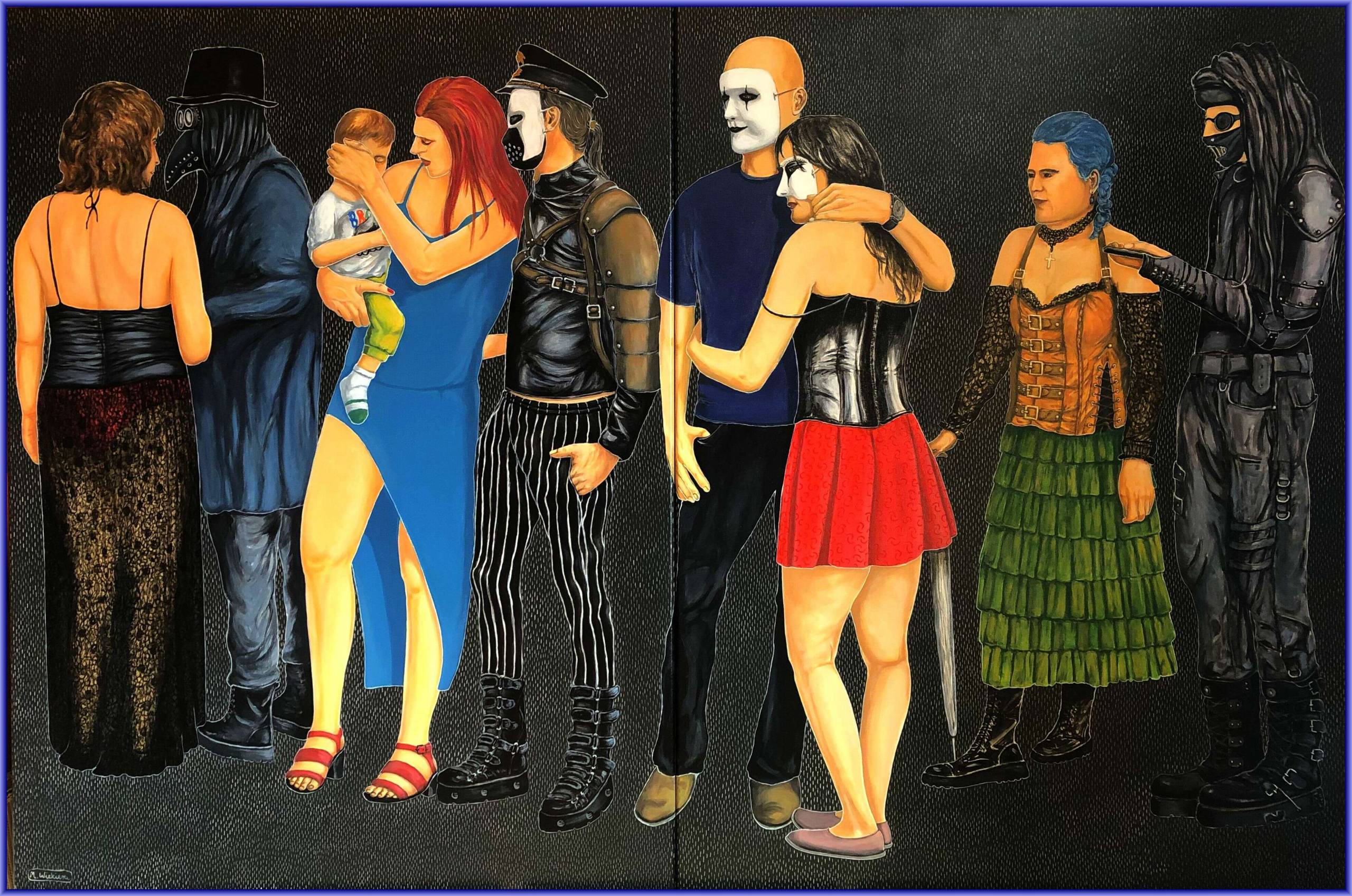 Obraz przedstawia grupę postaci ustawionych w szeregu, każda z nich wyróżnia się unikalnymi elementami ubioru i stylu. Dominantą kolorystyczną jest czerń, kontrastująca z intensywnymi odcieniami czerwieni, niebieskiego i zieleni. Kompozycja skupia się na różnorodności postaci i ich indywidualnych stylizacjach, tworząc swoistą mozaikę osobowości. Atmosfera obrazu jest intrygująca, może nawet trochę dziwna, jakby ktoś spojrzał w świat, gdzie codzienność miesza się z fantazją. Styl artystyczny to mix realizmu z surrealistycznymi akcentami, co nadaje dziełu specyficznego klimatu. Artysta zastosował precyzyjne techniki malarskie, uwypuklając detale ubioru i wyraz twarzy postaci. Emocje? Hmm, to obraz, który może wywołać mieszankę ciekawości i refleksji nad naszą tożsamością i rolą w społeczeństwie. Może podkreślać naszą różnorodność, a jednocześnie pokazywać jakieś wspólne experience. Obraz przypomina słowa, którymi można opisać ludzi na naszej drodze, każda postać niosąc swoją historię. „Hej, ten pan wygląda jak postać z bajki!” - mogłoby powiedzieć dziecko, patrząc z zaciekawieniem na tajemniczą postać w masce. To dzieło zachęca do osobistych refleksji i zastanowienia się, kim my sami jesteśmy w tej galerii postaci.