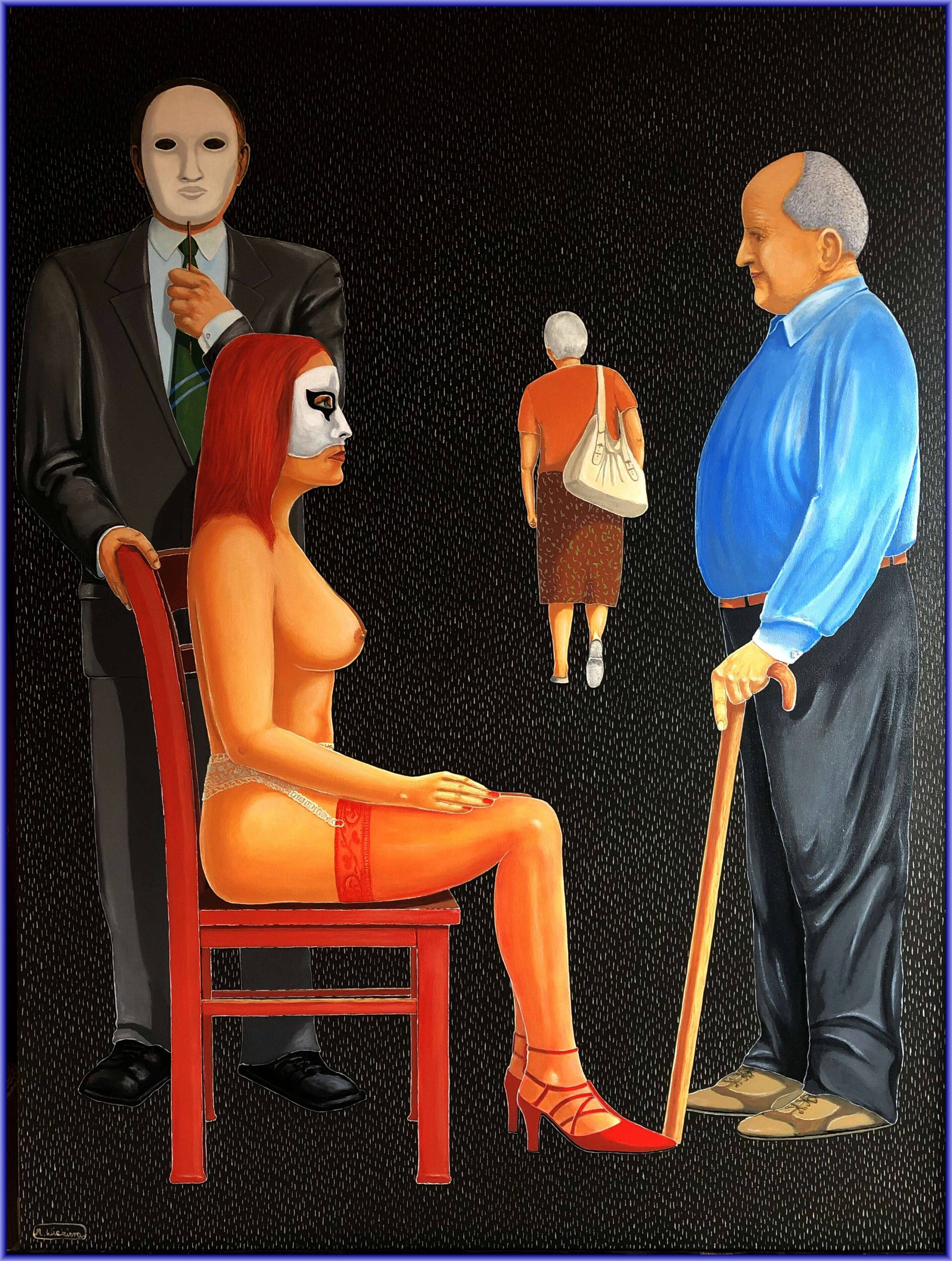 Obraz jest pełen kontrastów i napięcia. Na pierwszym planie widzimy siedzącą kobietę w czerwonych pończochach i makijażu przypominającym maskę. Siedzi na czerwonym krześle, a za nią stoi postać w garniturze i białej masce. Tajemnicza atmosfera malująca się w oczach sprawia, że całość wydaje się niepokojąco intrygująca. Jakby czas się zatrzymał w tej jednej chwili. Czarne tło potęguje poczucie izolacji, skupiając uwagę na postaciach. Starszy mężczyzna w niebieskiej koszuli patrzy z powagą, trzymając laskę. W tle nieśpiesznie oddala się starsza kobieta z białą torebką. Kolorowe akcenty, szczególnie czerwienie i błękity, ożywiają kompozycję. Styl obrazu jest surrealistyczny, z wyraźnymi konturami i kontrastowymi kolorami, przez co przypomina nieco dreamlike dream. Artysta posługuje się techniką płaskiej plamy barwnej, co nadaje dziełu abstrakcyjny charakter. Patrząc na ten obraz, można poczuć zarówno niepokój, jak i ciekawość. Co by było, gdyby mógł mówić? Może to opowieść o maskach, które nosimy na co dzień. Siedmiolatek powiedziałby: "Pan w masce wygląda trochę groźnie, jak duch." Emocje mieszają się z refleksją nad tym, jakie role przyjmujemy w życiu i jakie twarze pokazujemy innym. Who are we, really? Obraz z pewnością nie pozostawia obojętnym.