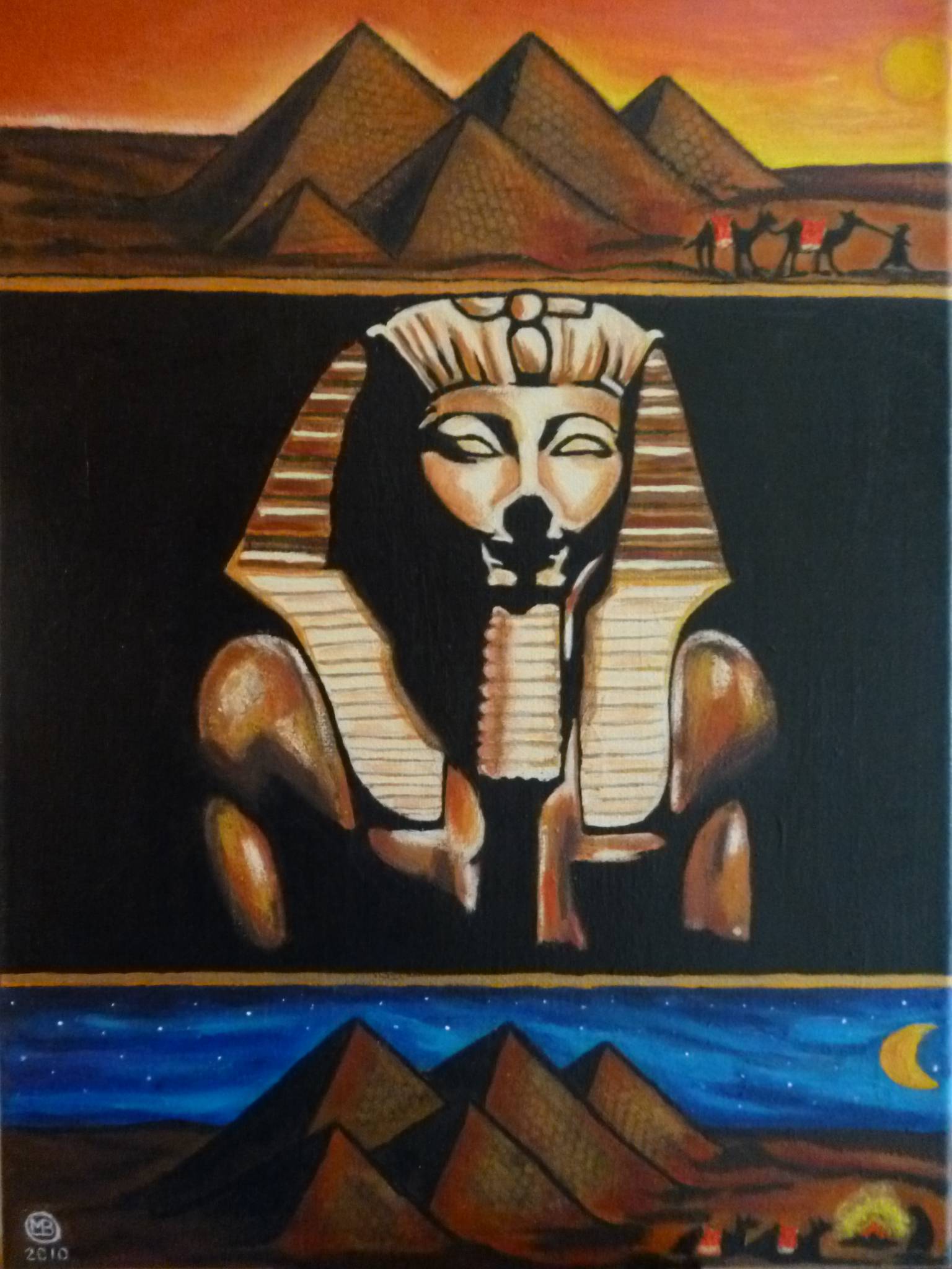 inspiracja; faraon z foto rzeźby czarno-białej,całość obrazu i koloru i tło na górze i dole kompozycja własna,(przy malowaniu piramid zastosowałam siatkę po cytrynach i gąbkę)