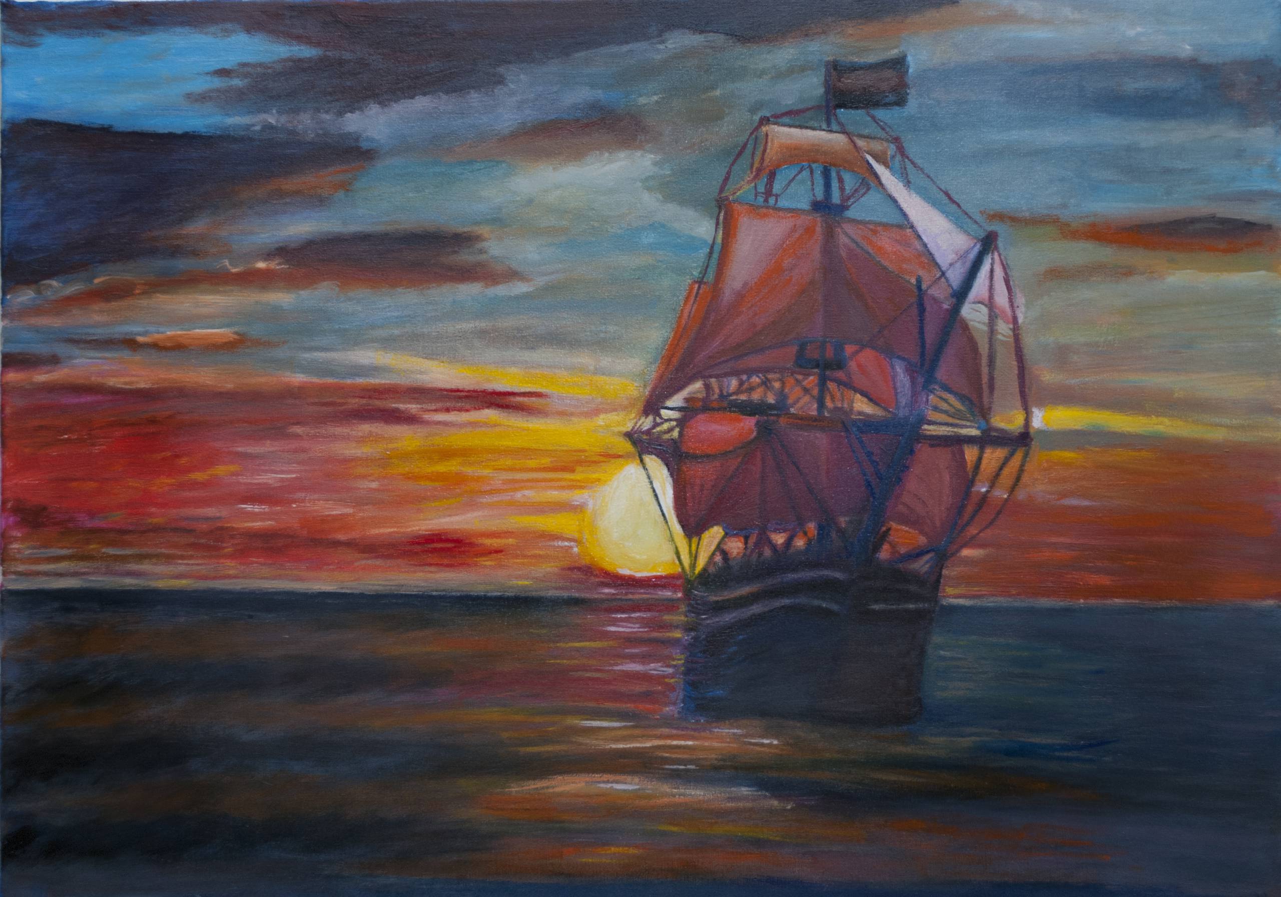 Na obrazie widzimy statek żeglujący po morzu w blasku zachodzącego słońca. Dominują tu ciepłe odcienie czerwieni, pomarańczy i złota, które kontrastują z chłodnymi błękitami i szarościami nieba. Kompozycja jest dynamiczna, z głównym motywem – statkiem – ulokowanym po prawej stronie, co nadaje dziełu pewnej tajemniczości. Statek wygląda jak z opowieści pirackich! Atmosfera obrazu jest pełna spokoju, ale i pewnego dreszczu przygody, jakby zapowiadała nieznane jutro. Artysta zastosował technikę impresjonistyczną, co widać w miękkich, rozmytych liniach i grze świateł. Obraz emanuje nostalgią, pochłania wzrok i sprawia, że zaczynamy marzyć. Może skłaniać do zadumy nad podróżami, przemijaniem i pięknem natury. Dla mnie to "captivating" doświadczenie, które zostawia widza z poczuciem ciszy i majestatyczności. To jak oglądanie snu na jawie – ciepłego i pełnego obietnic na przyszłość.