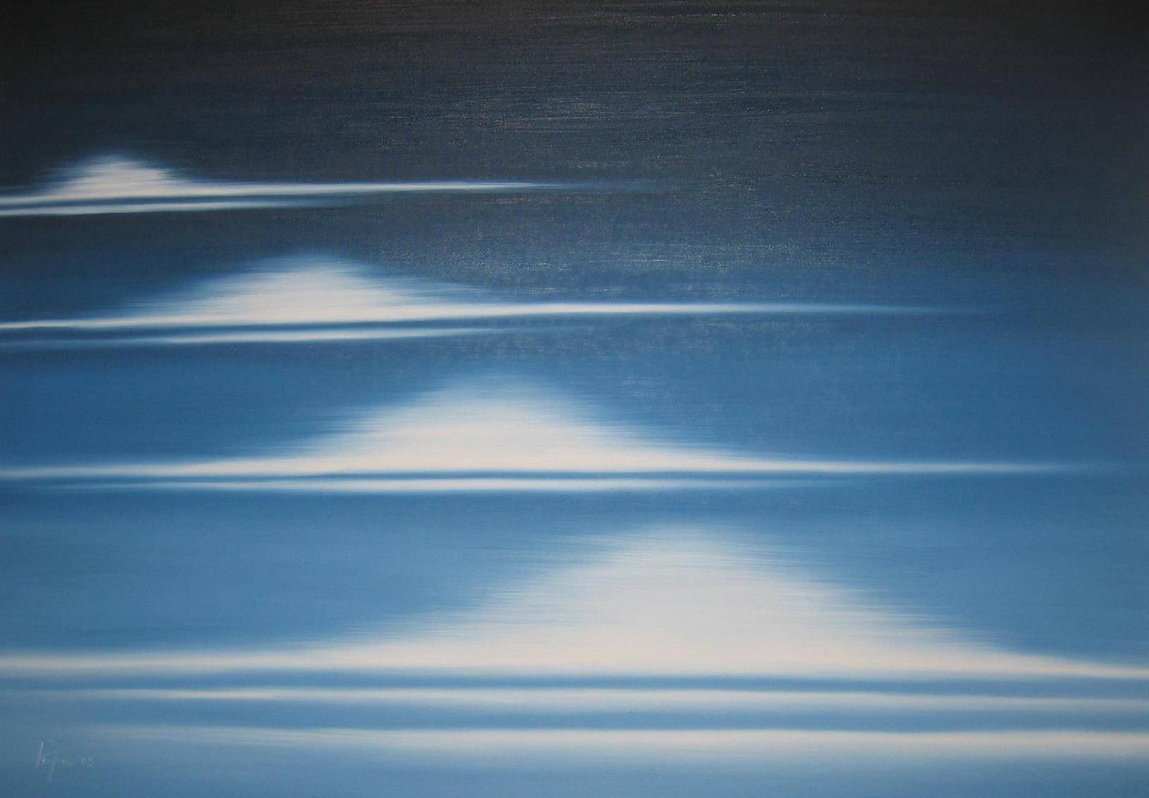 Na obrazie dominują gradienty niebieskich odcieni, przechodzące od głębokiego granatu do delikatnego błękitu. Subtelne białe linie przecinają kompozycję, tworząc uczucie płynności i spokoju, jakbyśmy patrzyli na spokojną taflę wody. To przywołuje myśl o porannym bezwietrznym oceanie, gdzie każdy dźwięk cichnie. Artysta zastosował technikę rozmycia, co nadaje obrazowi dreamy look. Linie są łagodne i spokojne, niczym fale na jeziorze Atmosfera obrazu emanuje ciszą i spokojem. Wygląda jakby świat zatrzymał się na chwilę. Przywodzi na myśl letnie poranki, kiedy dzień powoli się budzi, a światło słońca odbija się delikatnie na wodzie. Taka aura wprowadza w stan kontemplacji i wyciszenia Obraz może wywoływać różne emocje. Może sprawić, że poczujesz się zrelaksowany, jakby na moment oderwany od codziennego zgiełku. Albo wywołać nostalgię za wakacjami nad wodą. Dla dziecka taki widok to "wielka ślizgawka" na niebie Styl obrazu jest minimalistyczny, sugerując spokój i przestrzeń. To sztuka, która mówi do widza poprzez skromność. Artysta użył wyciszonych tonów i prostych form, aby osiągnąć elegancję i harmonię. Całość budzi refleksję i pozwala odpocząć duszy.