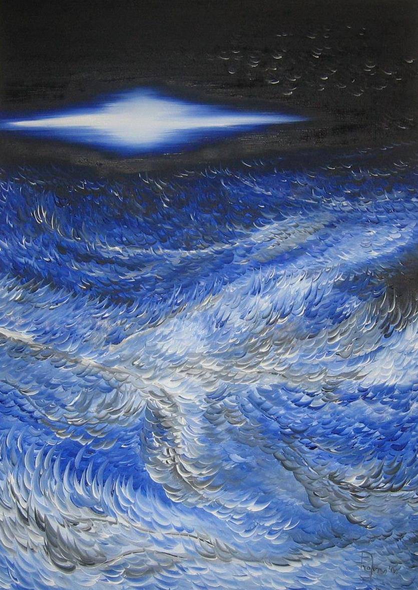 Ten obraz to prawdziwy kalejdoskop kolorów i kształtów, które od razu przyciągają wzrok. Dominuje tutaj kolor niebieski, w różnych odcieniach, od głębokiego granatu po delikatny błękit. Przypomina morskie fale, które falują i wirują, tworząc dynamiczną kompozycję. A tam w centrum, jasny punkt. Może to chwila ciszy, spokoju w chaosie. Atmosfera tego dzieła jest magiczna, enigmatyczna. Czuję się jakbym zaraz miał odkryć jakąś tajemnicę. Artysta zdecydowanie używa techniki impasto. Grubo nałożona farba tworzy tekstury, które sprawiają, że obraz niemal oddycha. To jest jak sztuka dotykowa, choć jej nie dotykasz. Oglądając, można poczuć ruch i energię płynącą z płótna. Could it be something more cosmic? Myśli błądzą w kierunku gwiazd i odległych galaktyk. Patrzenie na to dzieło wywołuje fale emocji. Jestem podekscytowany, trochę zdezorientowany. Czuję jakby mnie wciągało w swoją głębię. Mały Jaś powiedziałby: "To wygląda jak wielka, niebieska fala w kosmosie!". Siła wyobraźni tego obrazu jest nieograniczona. Naprawdę inspiruje do refleksji i marzeń.